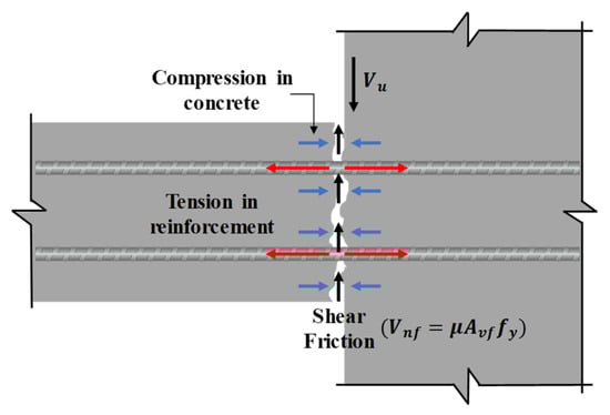 The precast concrete beam-column joints feature a joint surface between members at the connection or concrete splice. Birkeland and Mattock [20] demonstrated that the degree of roughness on the joint surface causes sliding and separation along the vertical plane between the beam and column. This mechanism explains shear friction by the concept that tensile forces acting on the through-reinforcing bars compress the joint surface. Based on this concept, ACI 318 [18] defines the shear strength (Vnf) due to shear friction bars as follows: