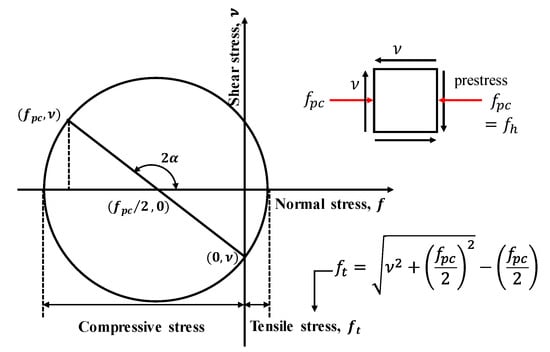 From Mohr’s stress circle shown in Figure 6, the tensile strength (ft) and shear strength (ν) with horizontal prestress can be derived as follows: