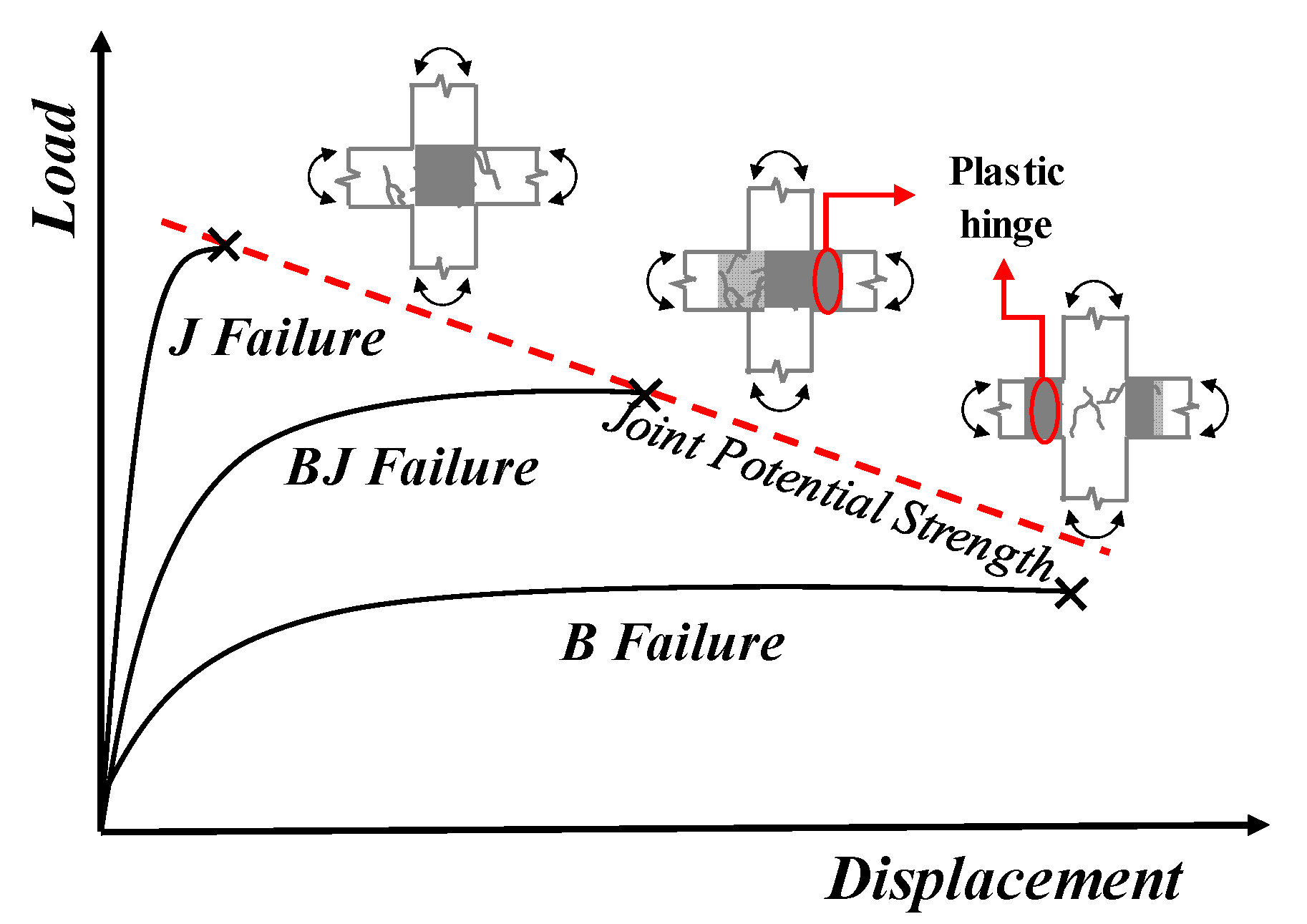 By comparing Equation (1) for V j and Equations (3) and (4) for V j b y , the smaller value is considered the shear strength of the beam-column joint. That is, in the case of V j < V j b y , the shear force acting before plastic hinging occurs in the beam exceeds the joint strength, causing failure at the joint (J Failure). Conversely, when V j V j b y , as shown in Figure 4, the main reinforcement in the beam yields, and the plastic hinge formed in the beam determines the joint strength. However, the final failure mode in this case can again be divided into two types—BJ and B failures. BJ Failure occurs when the deformation of the beam propagates into the joint after a plastic hinge forms in the beam, ultimately causing failure at the joint. B Failure occurs when the deformation of the joint does not reach the failure point, and failure occurs solely in the beam. It is quite difficult to accurately distinguish the B and BJ failures. Therefore, this study aims to establish a database of beam-column joint specimens from the literature to identify valid variables affecting the failure mode.