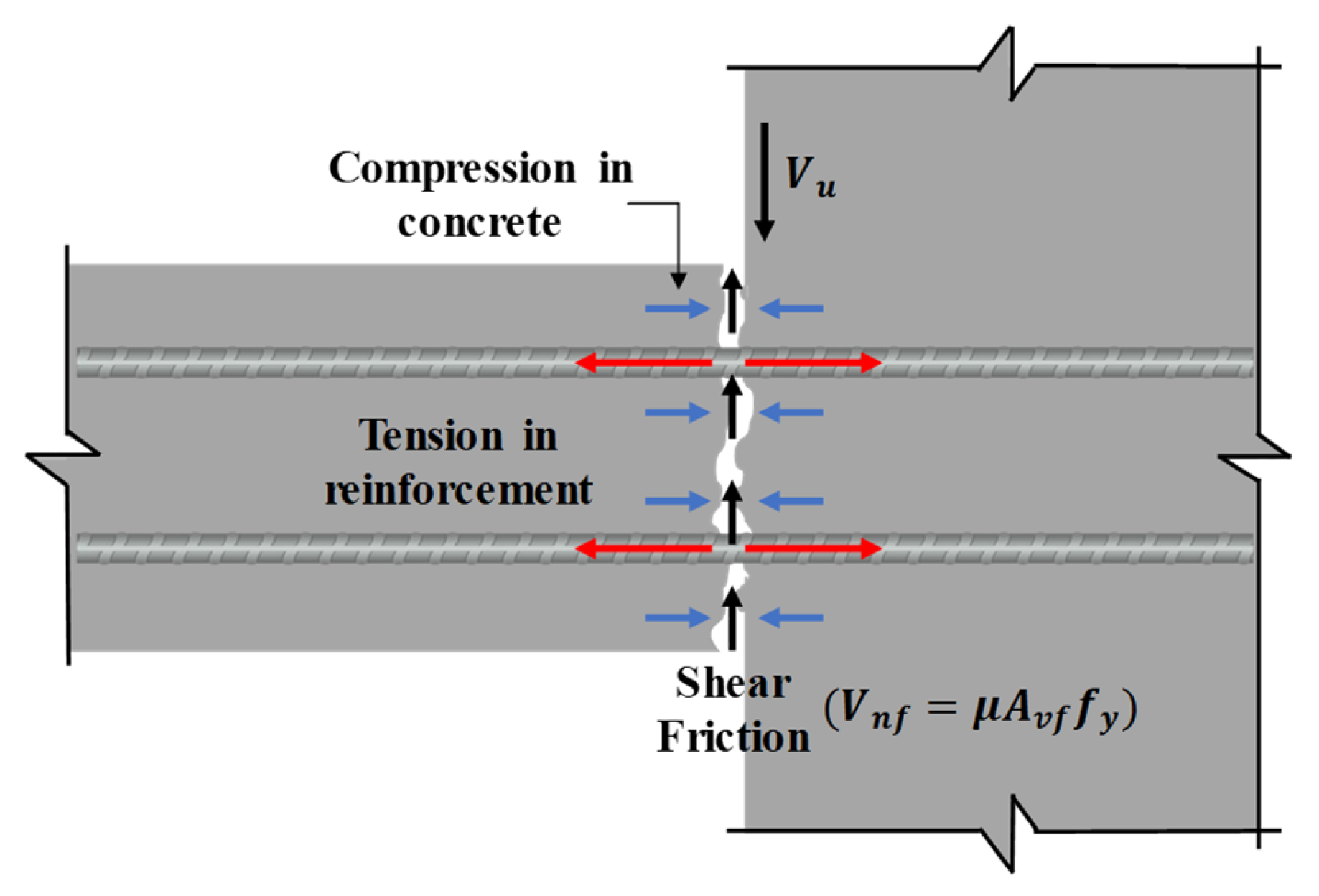 where μ is the coefficient of friction, determined by the condition of the joint surface, Avf is the cross-sectional area of the reinforcing bar assumed for shear resistance across the shear plane, and fy is the yield strength of the reinforcing bar.