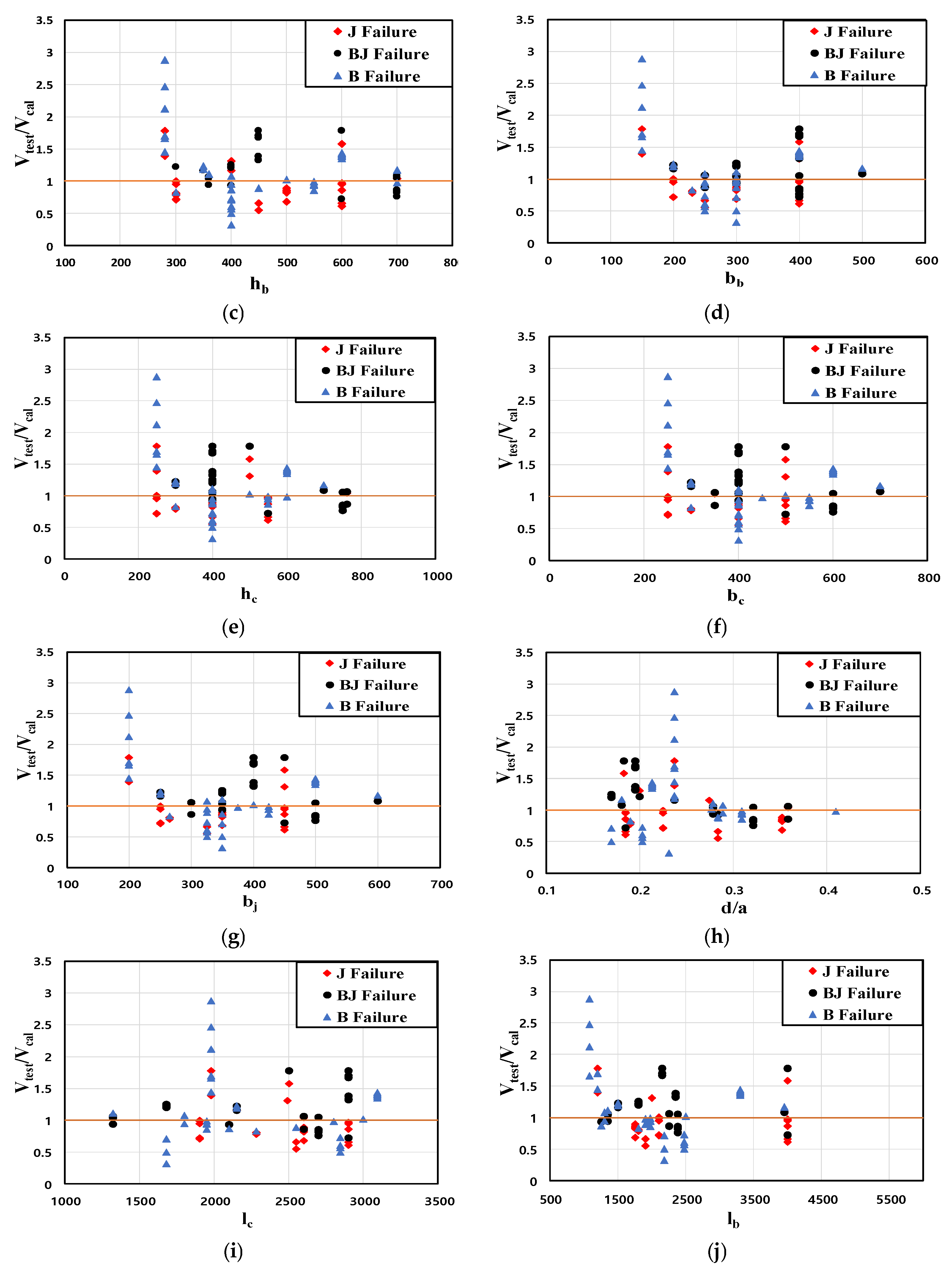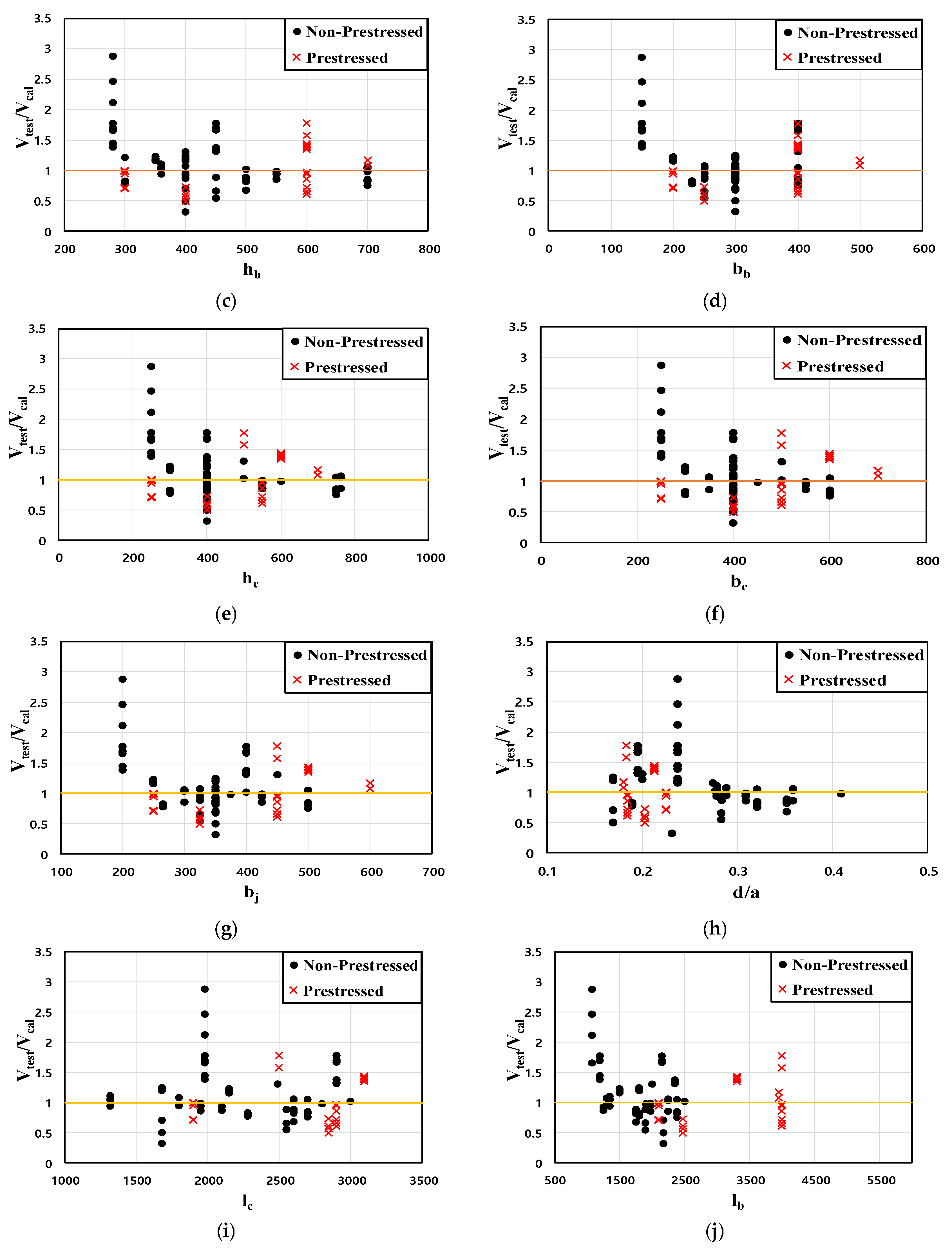 All variables related to cross-sectional dimensions (bc, hc, bb, hb, bj) show a similar trend. The variables predict a large shear strength compared to experimental values for small cross-sections, indicating a very conservative approach. As the cross-section increases, the safety margin tends to decrease. For columns, test specimens were generally close to square (i.e., b c h c and smaller column sizes tended to underestimate the shear strength at the joint. For beams, specimens with hb larger than bb were more common. Unlike columns, no distinct trend emerged for beams; underestimation of shear strength occurred for small beams and for relatively large beams around hb = 600 mm and bb = 400 mm.