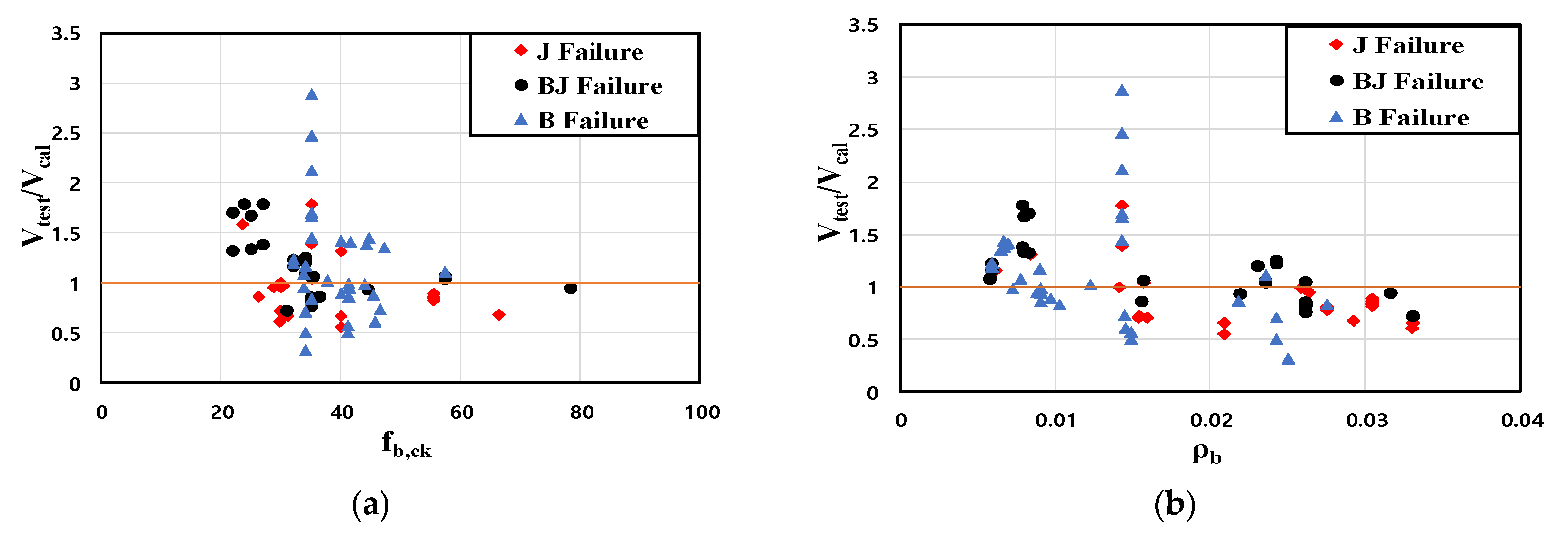 As shown in Figure 7a, the shear strength was generally evaluated on the safe side (Vtest/Vcal > 1) in the range where the concrete compressive strength (fb,ck) was 40 MPa or less; however, the data dispersion is significantly large.