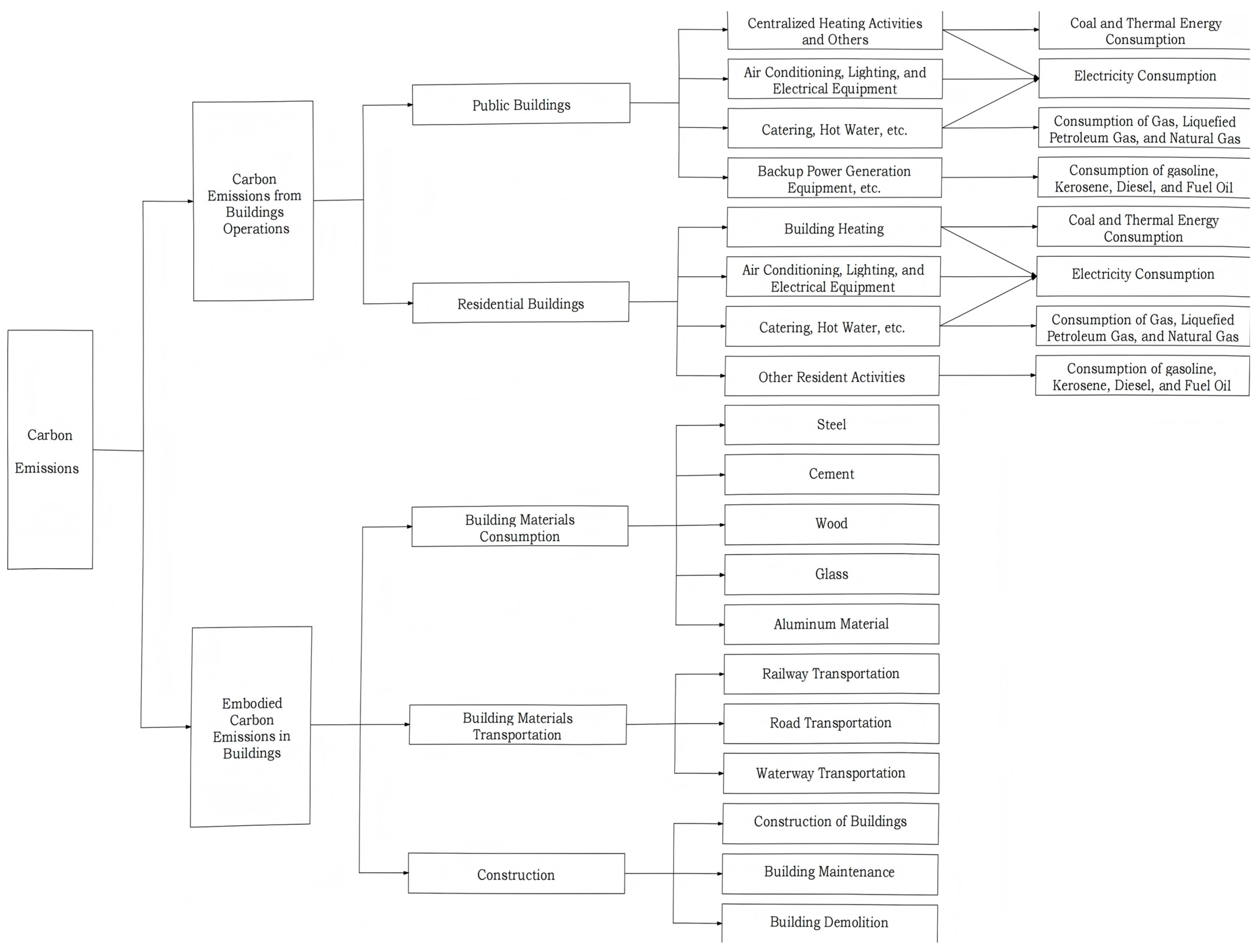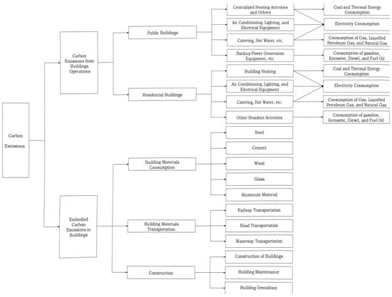 Based on the actual situation and considering that the CE in the construction industry mainly occur in two stages, this paper divides the CE of the construction industry into operational CE and embodied CE. Operational CE mainly come from the CE caused by the direct consumption of fossil fuels, electricity, and heat during the building operation phase. These emissions are primarily generated from activities such as cooking, water heating, lighting, electrical equipment, and decentralized heating in buildings. Embodied CE mainly originate from the CE caused by construction and building materials production. The embodied carbon of buildings covers the entire life cycle of building materials and mainly comes from the energy and material consumption in three major links: production and processing, logistics and transportation, and maintenance and demolition [3], as can be seen in Figure 1.