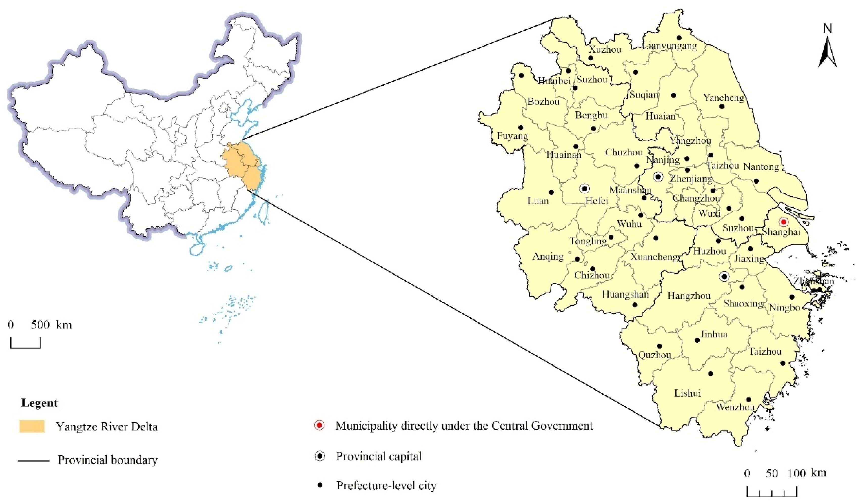 The geographical distribution of these 41 cities within the Yangtze River Delta is shown in Figure 1.