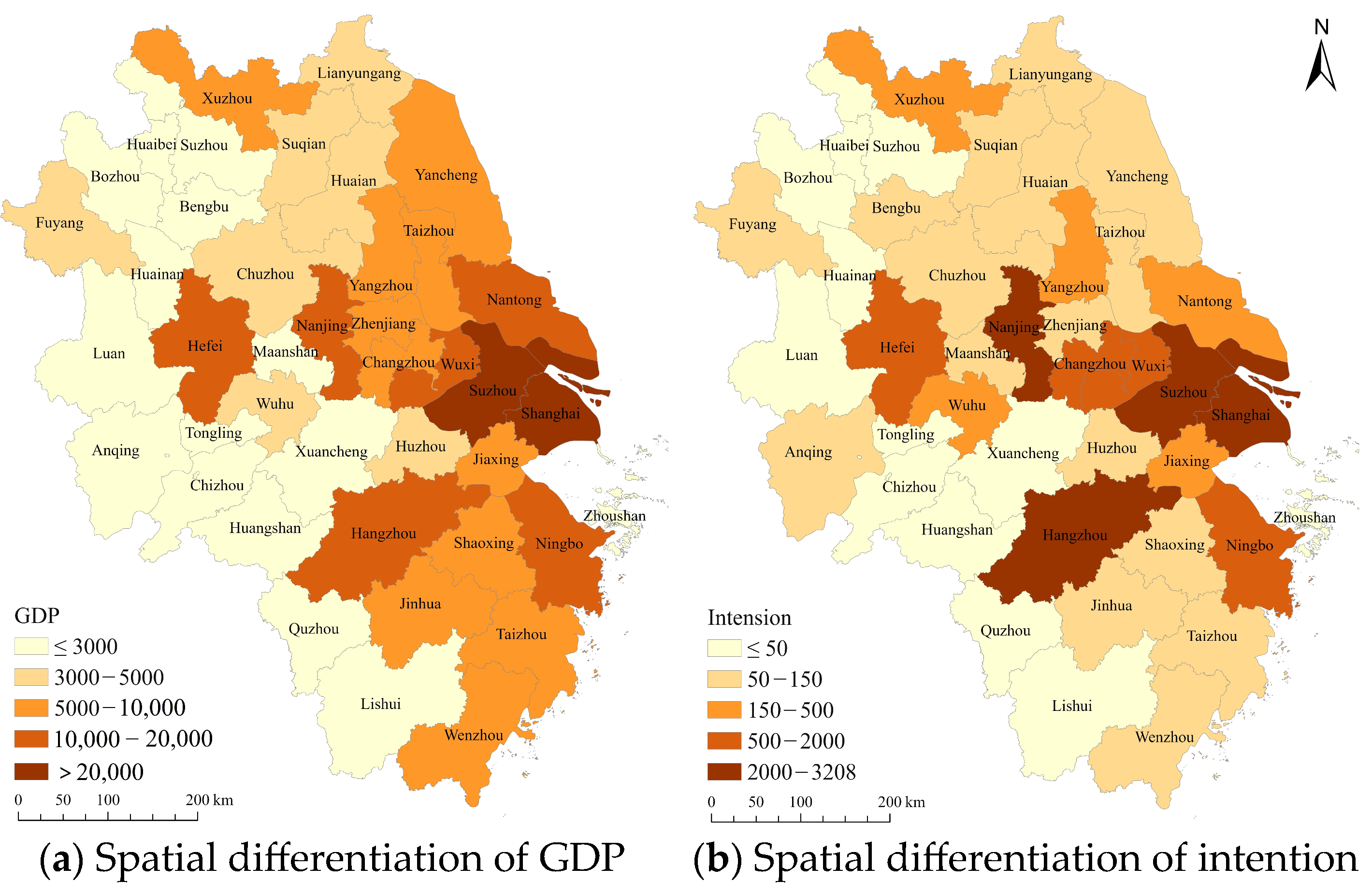 Records where the residence city and intended destination were the same were excluded from the talent mobility count, as no inter-city movement was involved. After this exclusion, 1640 valid records were obtained. To mitigate bias arising from varying city sizes, talent mobility intention was expressed as the number of job seekers per 100,000 registered population of the residence city, calculated by dividing the number of job seekers by the household registration population of the residence city. The spatial differentiation of GDP and talent mobility intention across the 41 cities is shown in Figure 2.