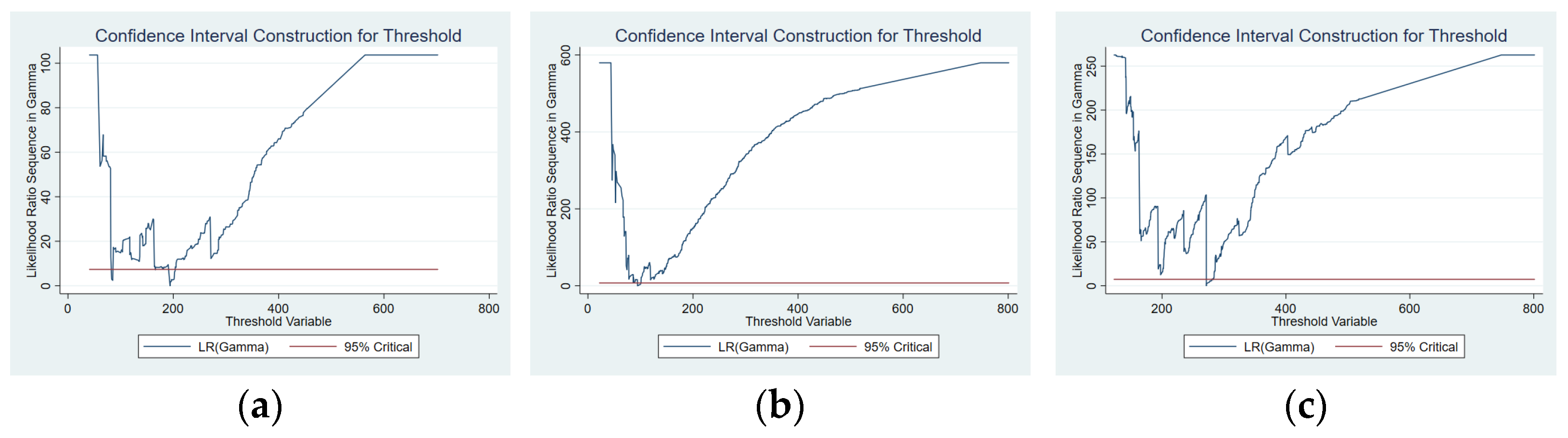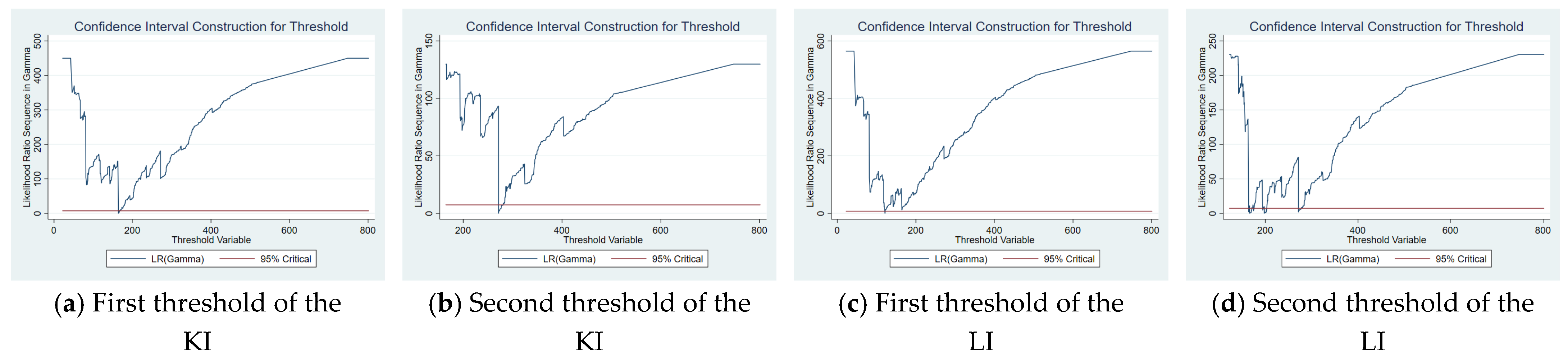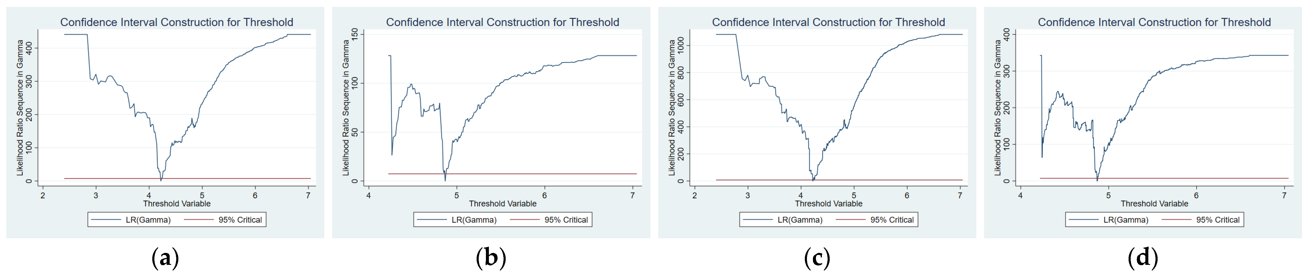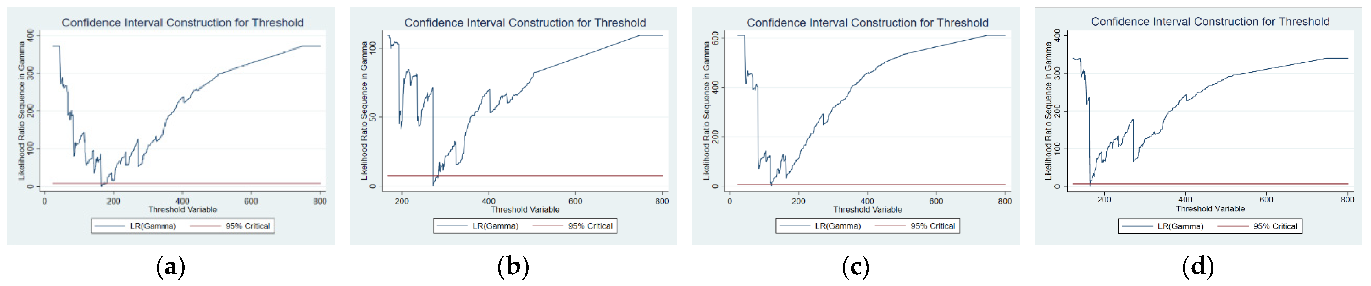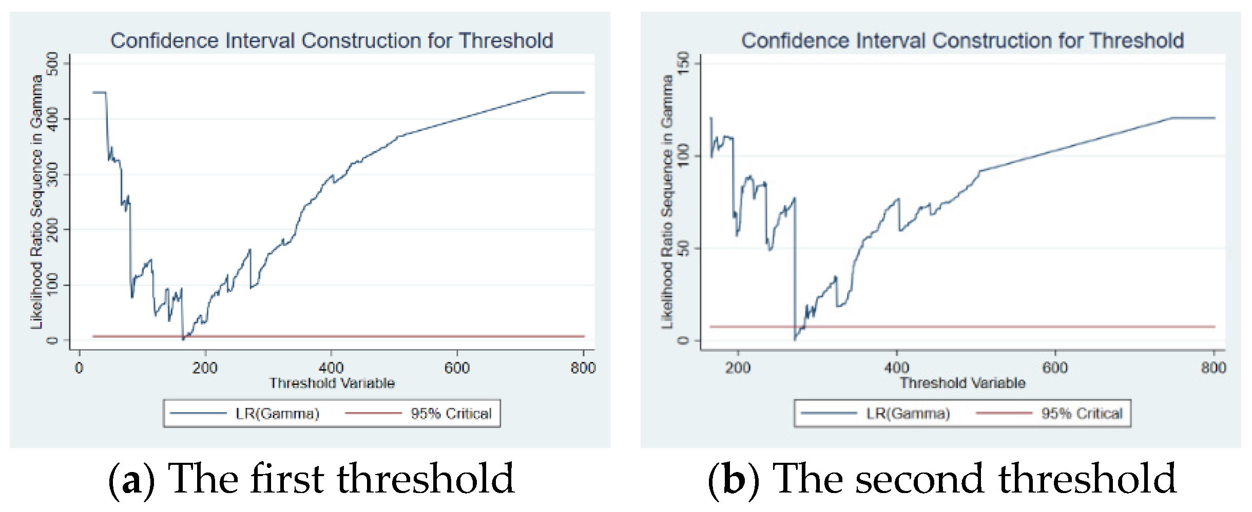 Figure 3 shows the likelihood ratio function plot for the second threshold estimation of inter-city distance. The lowest points of the LR statistics correspond to the true threshold values. Since both values in the figure fall below the critical value indicated by the horizontal line, the two thresholds are statistically significant and valid.