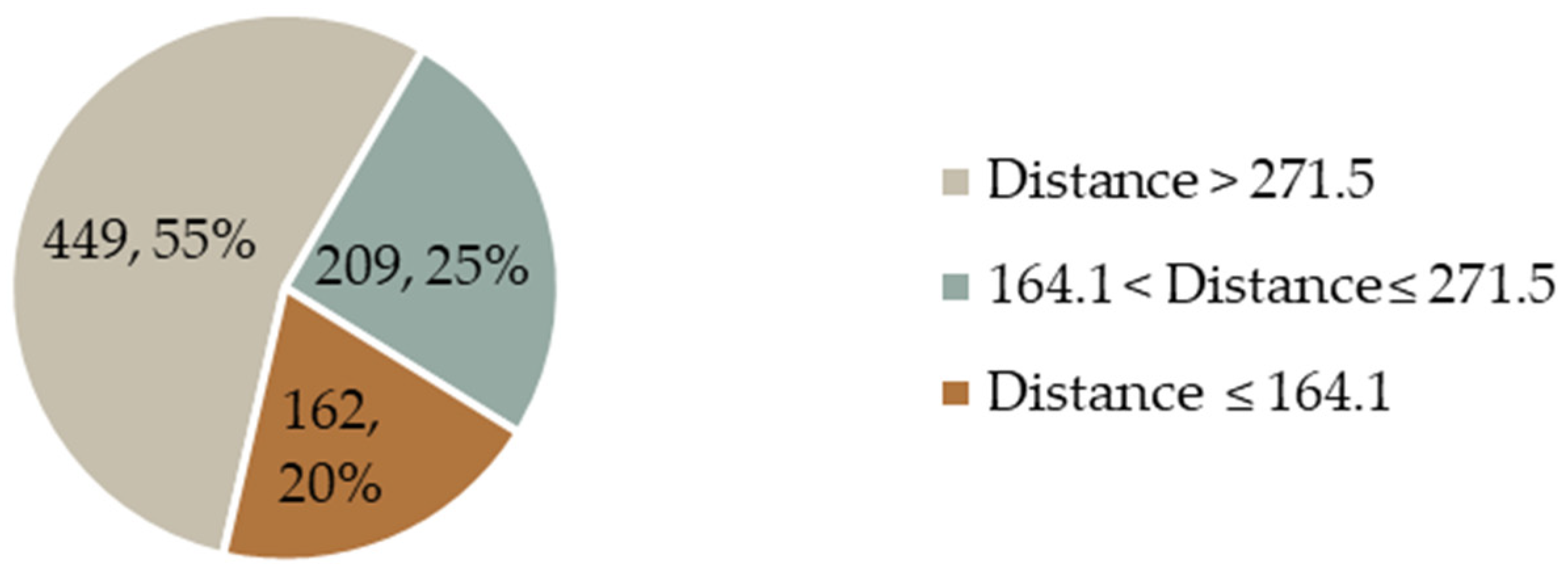 A total of 820 distinct inter-city distance records were obtained (excluding cases where the origin and destination cities are identical). Among these, 162 records exceed 164.1 km, 209 fall within the range of 164.1 km to 271.5 km, and 449 records are greater than 271.5 km, as illustrated in Figure 4.