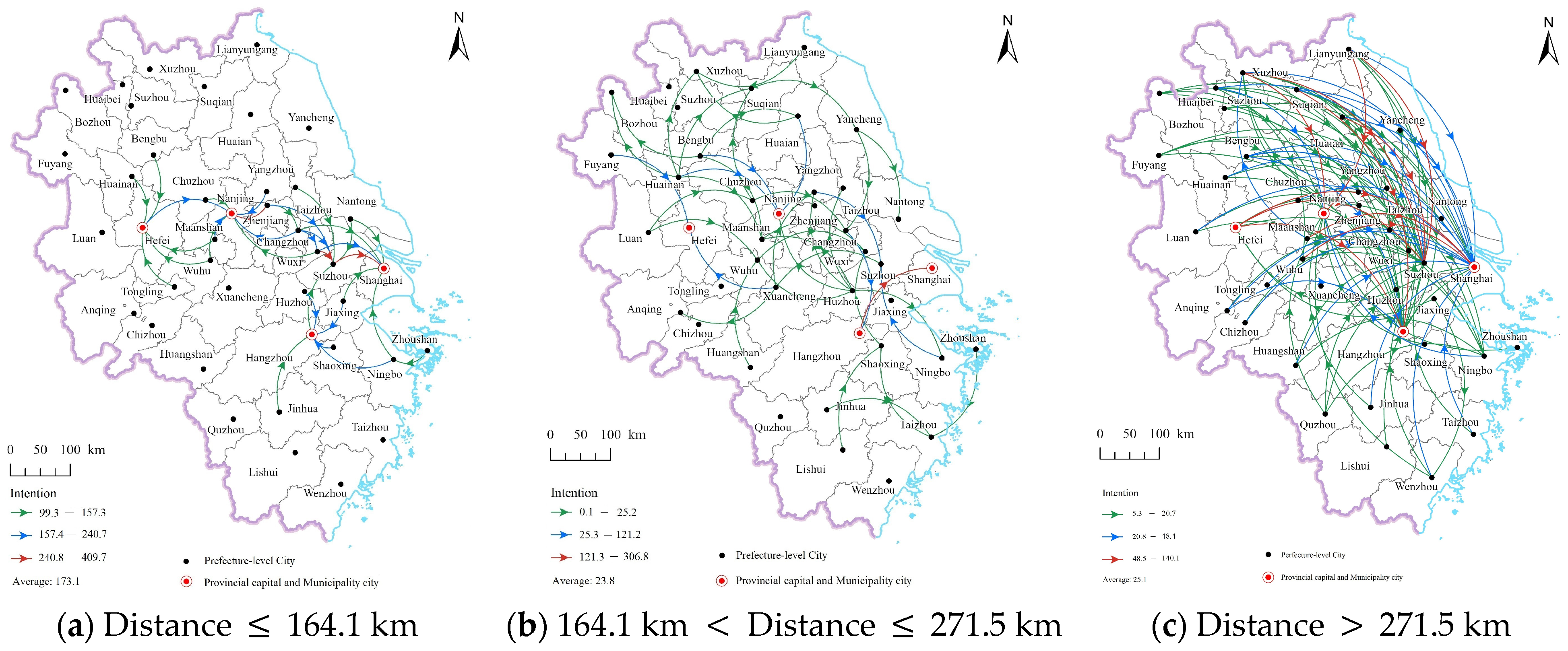 The top 20% of talent mobility flows across the three distance intervals are visualized in Figure 5. In the short-distance interval (≤164.1 km), 33 flows are identified, primarily concentrated between cities in southern Jiangsu and northern Zhejiang. Most of the economically developed cities in the Yangtze River Delta are located within this distance range. The medium-distance interval (164.1–271.5 km) contains 42 flows, mainly connecting northern Anhui, southern Jiangsu, and a few cities in Zhejiang. Unlike the other two intervals, destination cities in this range are not as distinctly concentrated. The long-distance interval (>271.5 km) comprises 90 flows. At these greater distances, talent tends to move from economically less developed cities to higher-tier economic centers such as Shanghai, Nanjing, Hangzhou, Suzhou, Wuxi, and Changzhou.