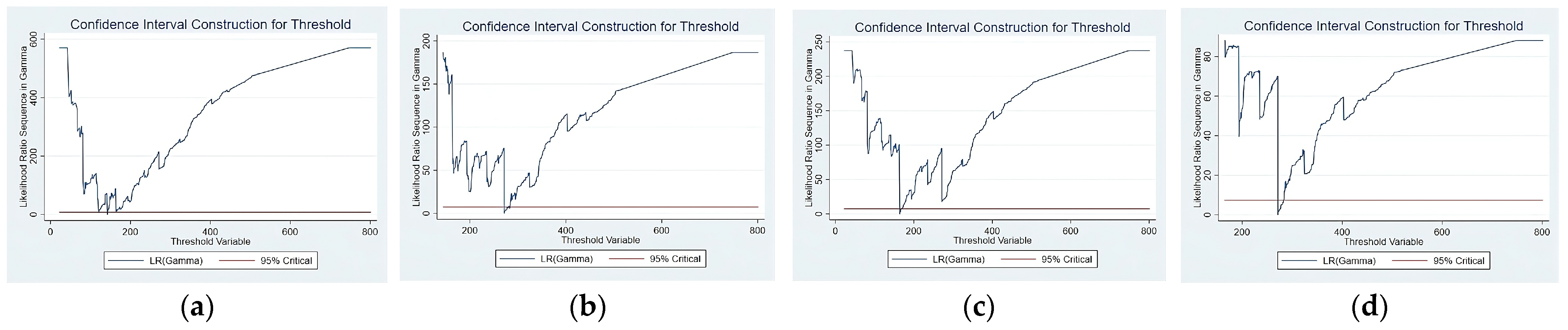 To further verify the robustness of these threshold estimates, we conducted sensitivity analyses regarding the model’s configurations. Specifically, we re-estimated the model under the assumption of heteroskedasticity and varied the trimming proportion for the grid search (ranging from 5% to 15%). The results indicate that the estimated threshold values remained highly consistent across these varying settings, confirming that threshold selection is robust and not driven by specific parameter constraints.