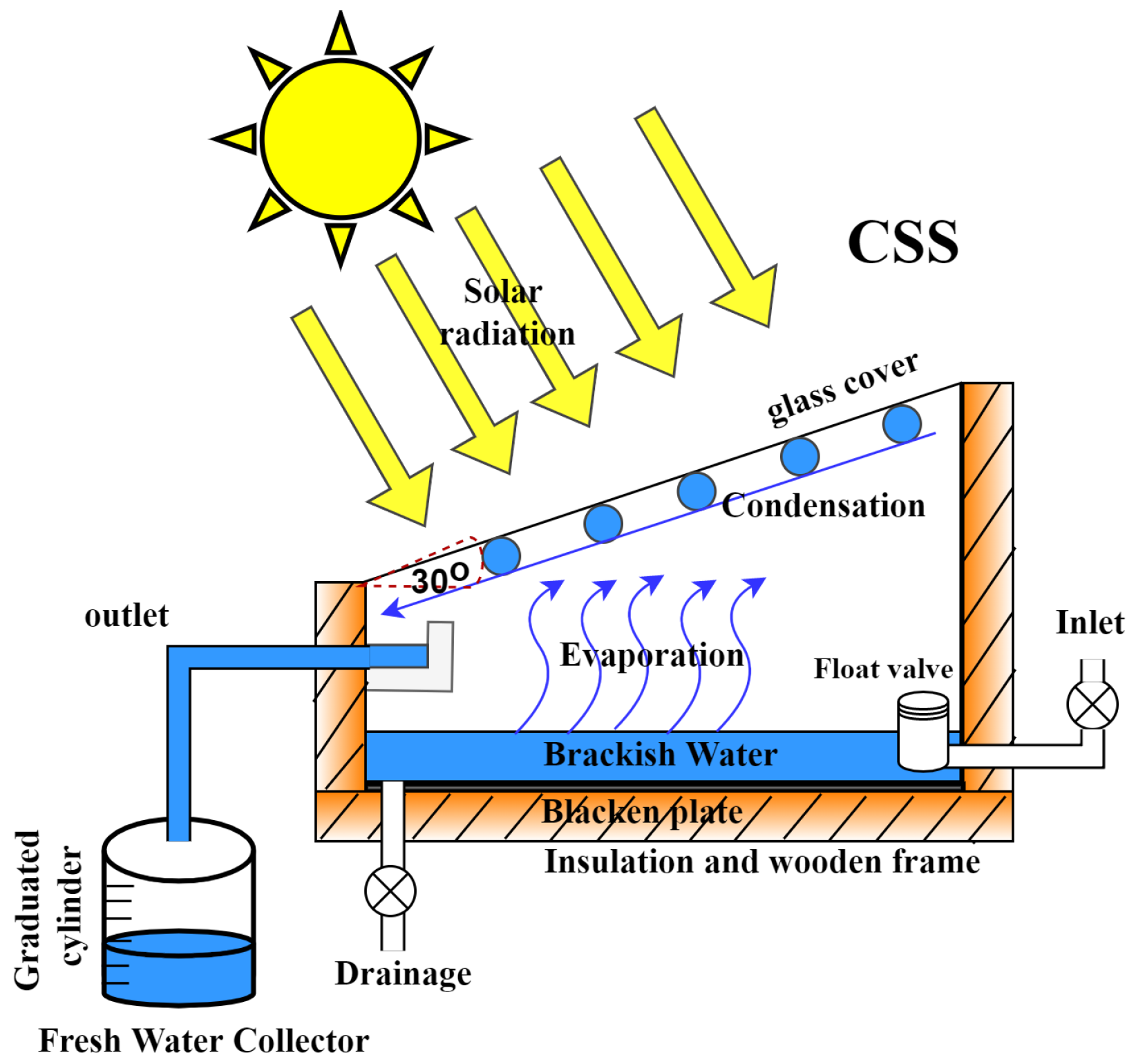 The selection of a 30° inclination angle for the 4 mm thick transparent glass cover was based on the latitude of Basrah, ensuring optimal solar incidence throughout the year. This angle also facilitates smooth condensate runoff into the distillate collection channel, which was constructed using a half-section PVC pipe fixed along the lower edge of the glass [25].