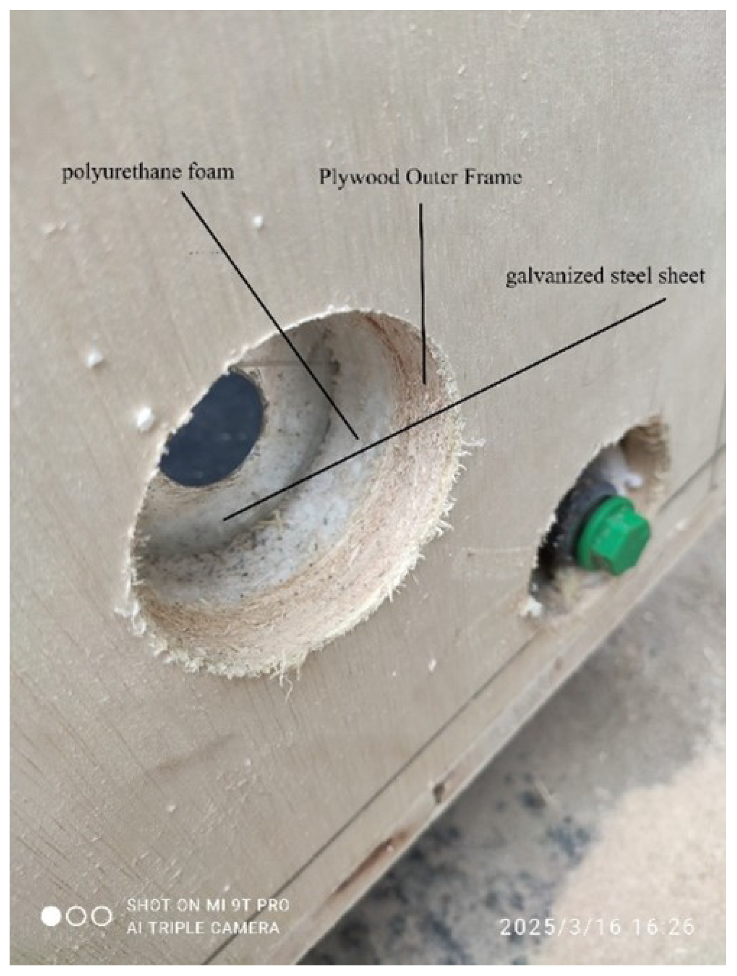 Thermal insulation of the basin was achieved through a dual-layer strategy (Figure 3). Expanded polystyrene (EPS) foam boards (2–3 cm thick) were applied to the base and sidewalls, followed by polyurethane foam injection to fill remaining voids, then he basin was enclosed within a wooden plywood frame (19 mm thick), which served as the external structural casing. This approach was guided by previous studies recommending minimized conductive losses through the structure [27].