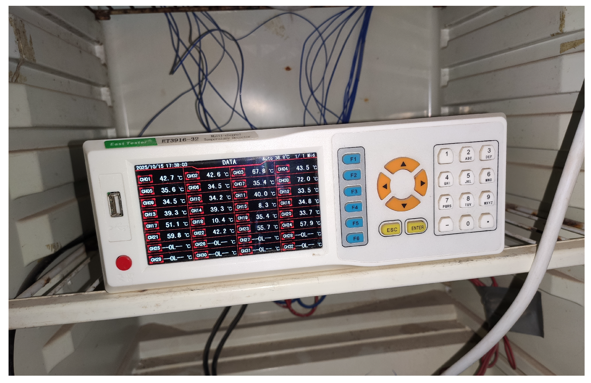 A 32-channel data logger (Model: ET3916-32) (Figure 6) was used to continuously record thermal parameters within the solar still system. Measurements were logged at 1-minute intervals and stored in CSV format, as seen on the logger interface (Figure 6). The following locations were monitored with Type-K thermocouples: (more than one measurement point for each part was taken; see Figure 2)