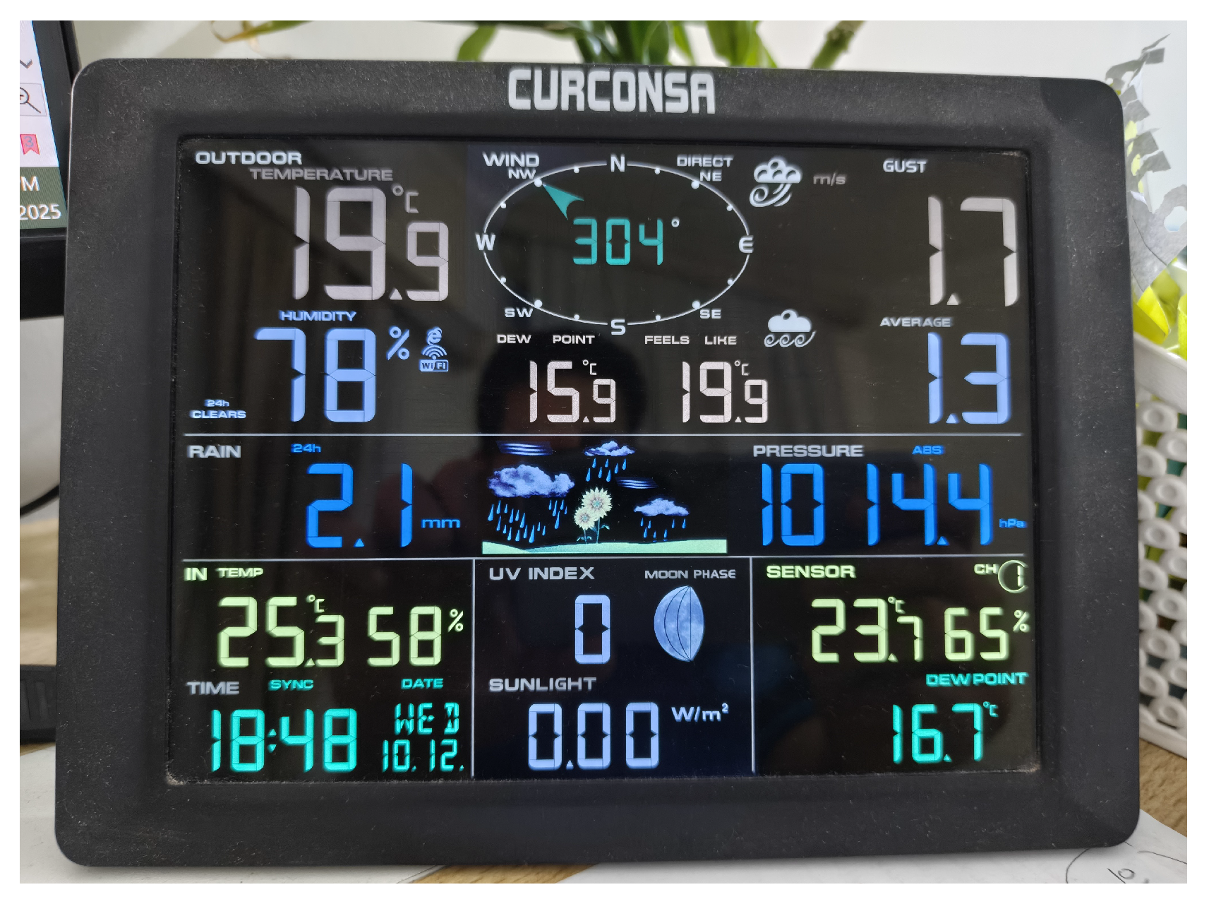 To further support experimental accuracy, an indoor wireless receiver module was used to monitor live environmental readings throughout each test day. The receiver, part of the CURCONSA FT0300 weather station, provided real-time updates on the following: