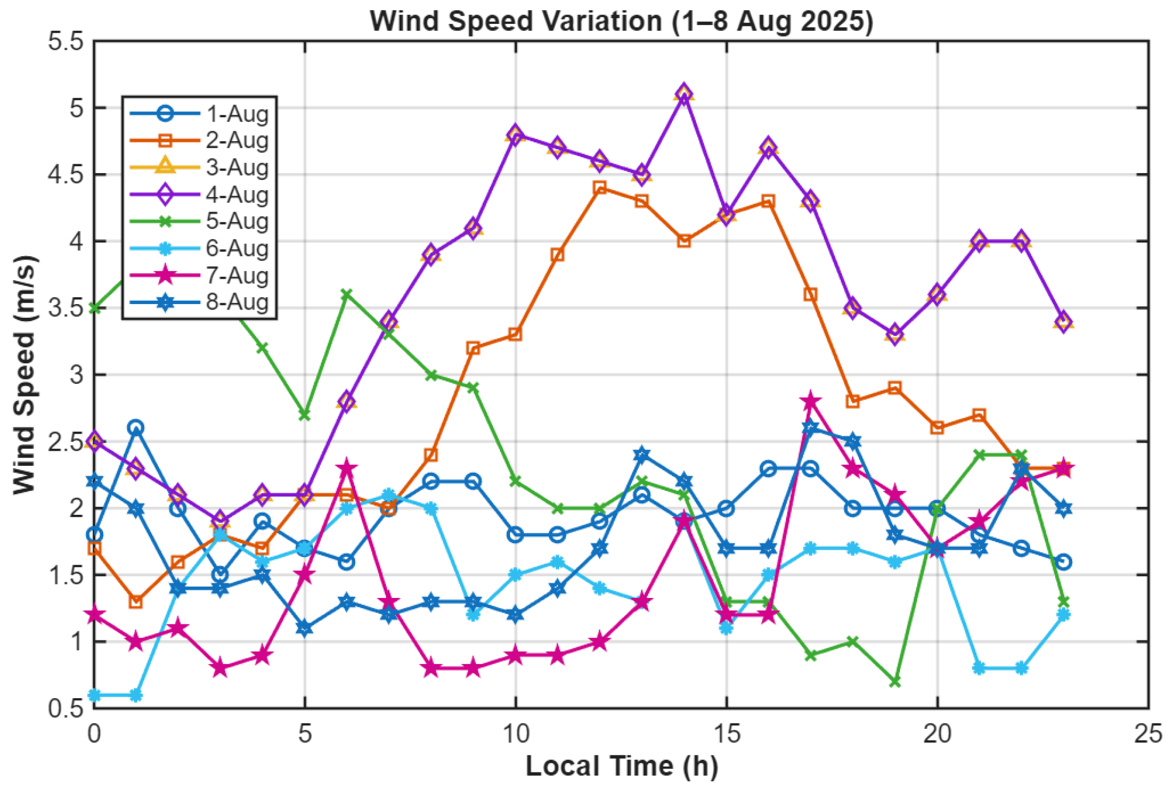 Figure 10. Diurnal variation in wind speed during 1–8 August 2025 in Basrah.
