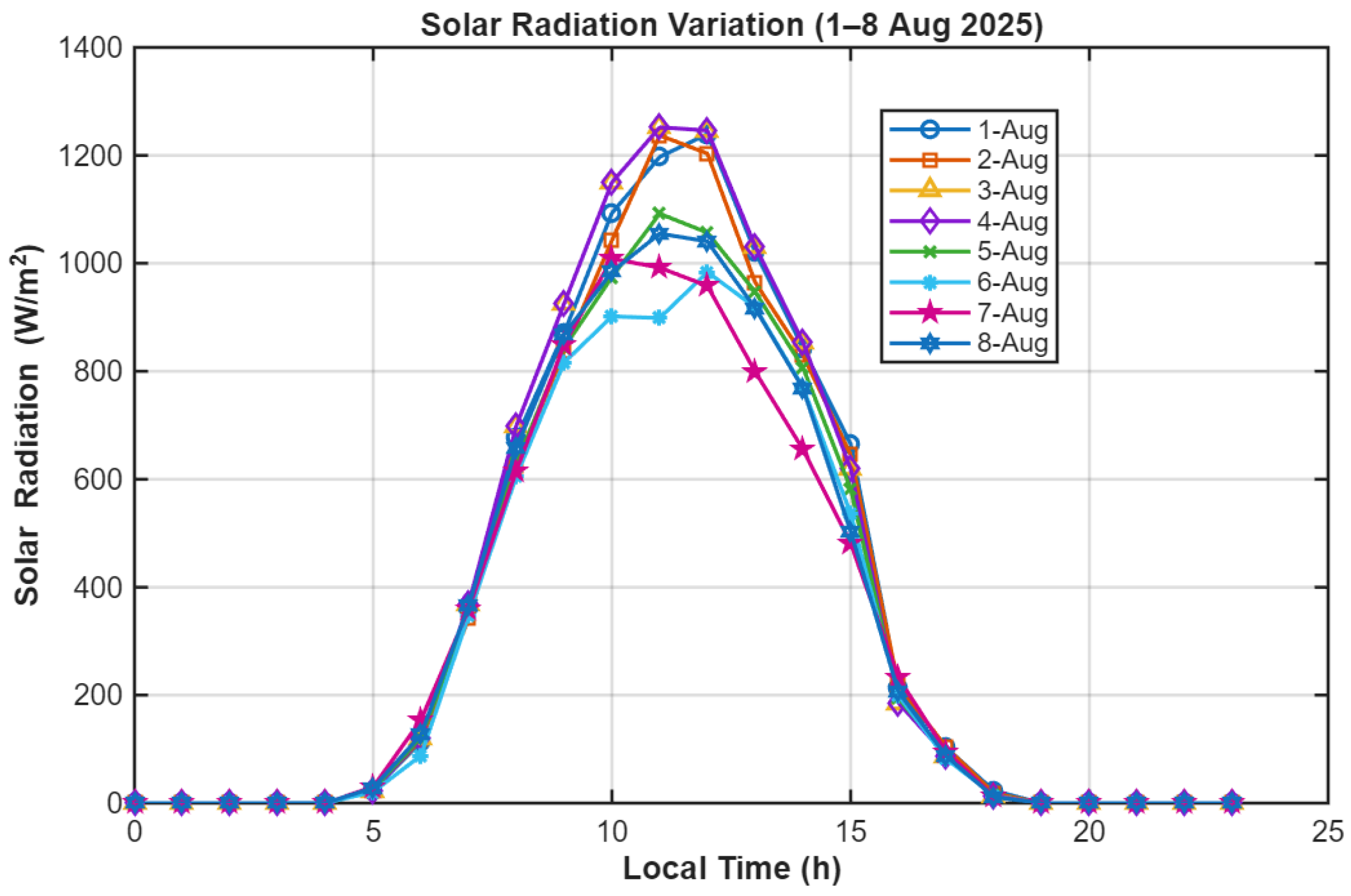 Figure 11. Diurnal variation in solar radiation during 1–8 August 2025 in Basrah.