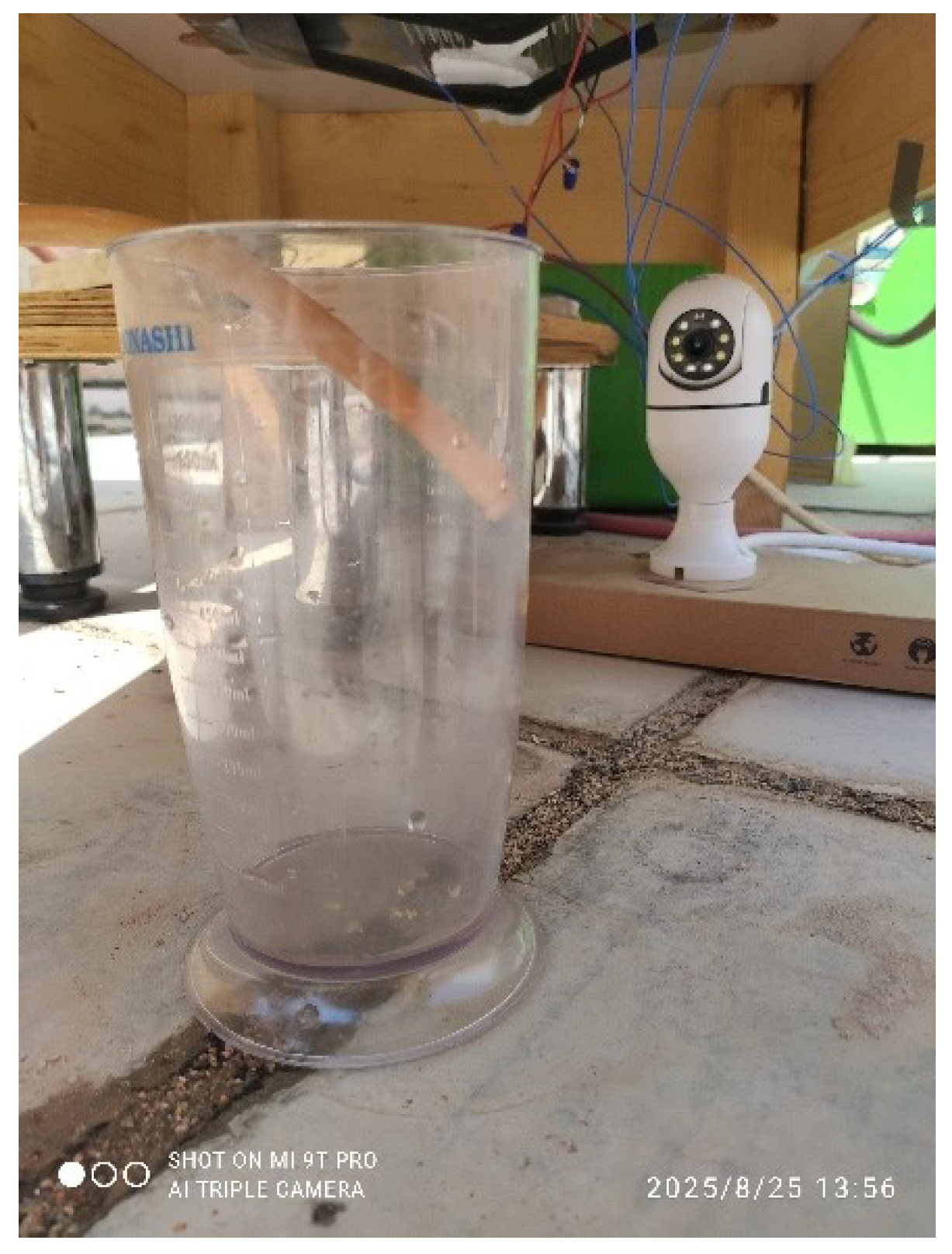 The brackish water was sourced daily from the Shatt al-Arab River, with salinity measured at 5.2 g/kg (5200 ppm). The basin was flushed and refilled before each test, and the water level was maintained via a float valve at 2.0 cm to ensure consistent thermal loading. Salinity variation during a single test day was negligible and thus treated as constant for modeling purposes. The water level inside the basin was maintained at a constant depth of 2 cm throughout the experiment to ensure uniform thermal conditions. Hourly experimental values of basin water temperature ( T w ), basin liner temperature ( T b ), and glass cover temperature ( T g ), along with distillate output ( P d ), were recorded using a calibrated multichannel data logger and a graduated cylinder, with visual monitoring supported by a camera, as illustrated in Figure 13.