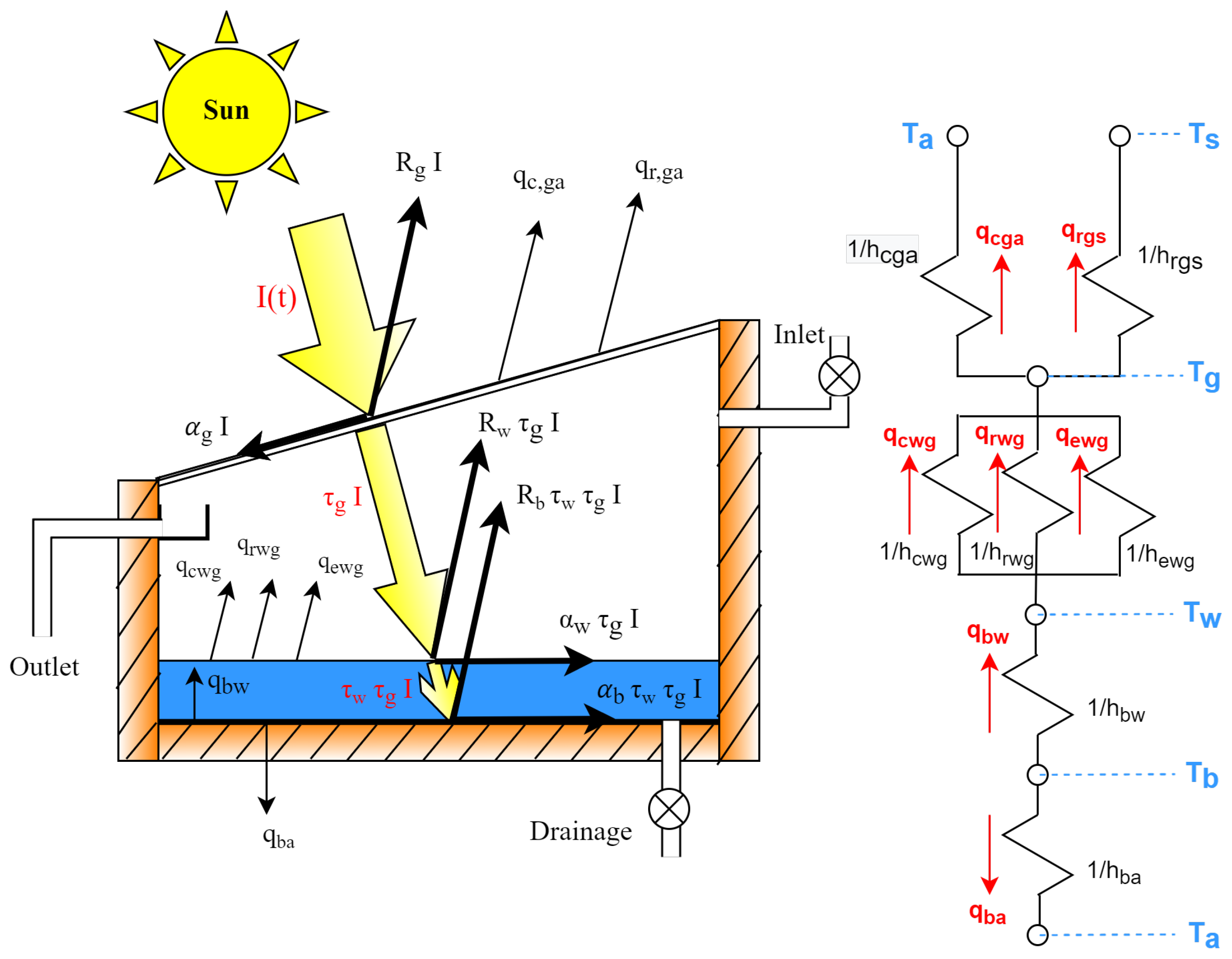 The thermal performance of a basin-type solar still is primarily governed by transient heat transfer processes, as temperatures, solar input, and heat fluxes vary continuously with time. Figure 14 illustrates the overall energy interactions inside the still, including the incident solar radiation, absorption, reflection, and the complex convective, radiative, and evaporative exchanges occurring between the basin water, basin liner, glass cover, and the surrounding environment. A mathematical model was developed to describe these processes using energy balance equations applied to three main components: basin water, basin liner, and glass cover. These balances account for absorbed solar radiation, thermal storage, interfacial heat transfer, and evaporative condensation mechanisms. The governing equations were solved using MATLAB, enabling the prediction of temperature profiles, heat transfer rates, and freshwater productivity. Model predictions were later validated against experimental data . Similar heat mass transfer approaches have been widely adopted in basin still modeling [24,29].