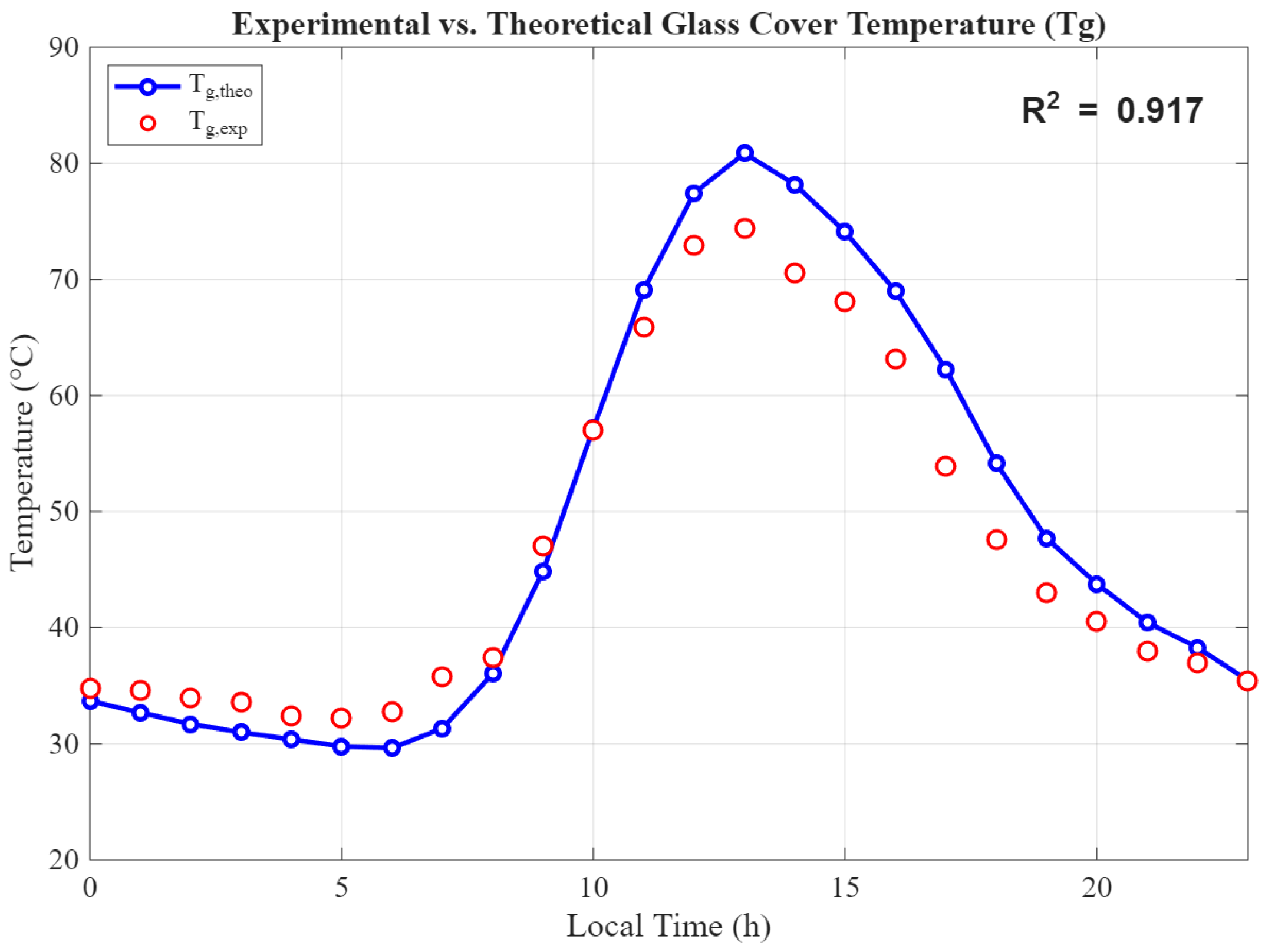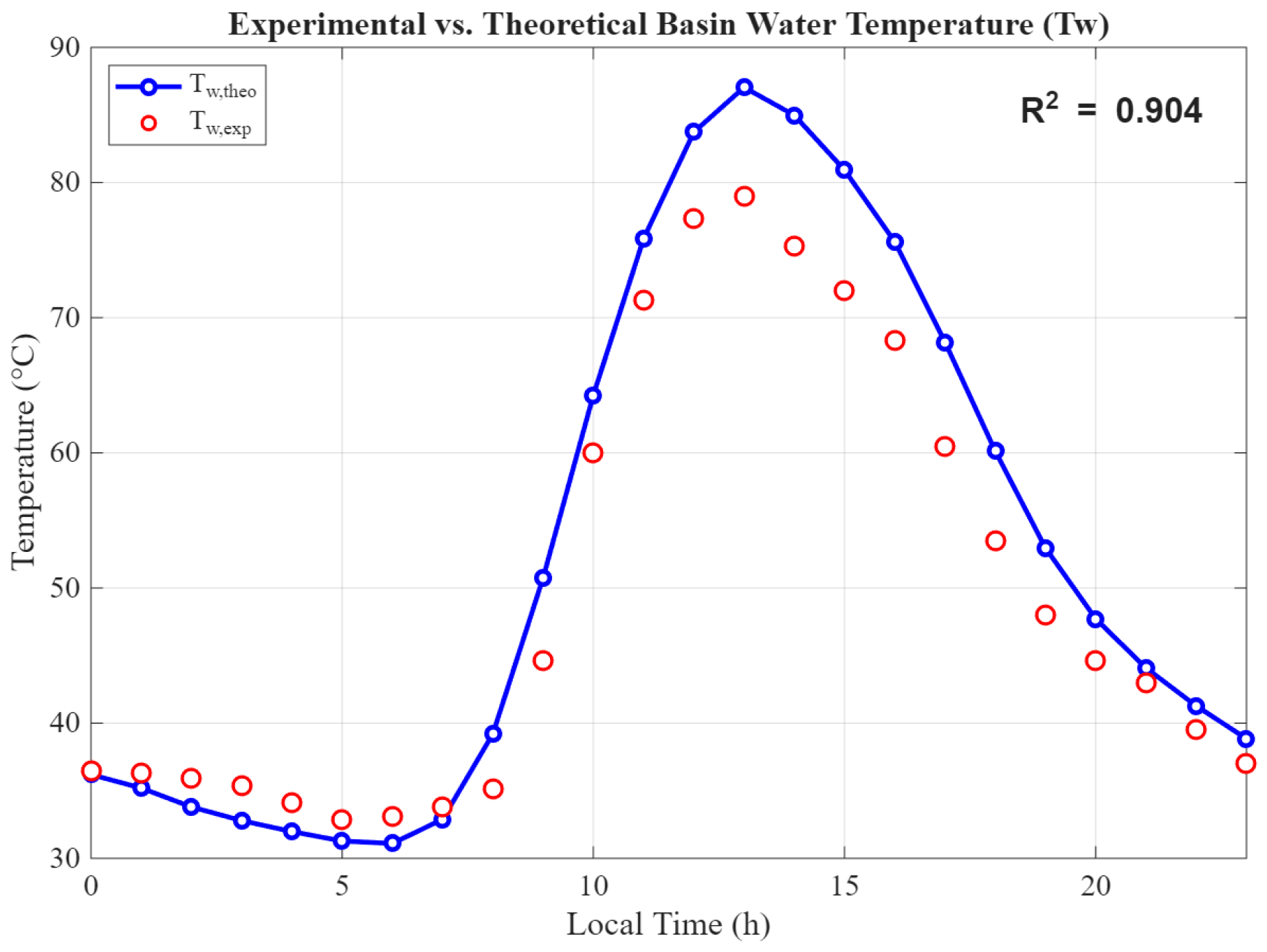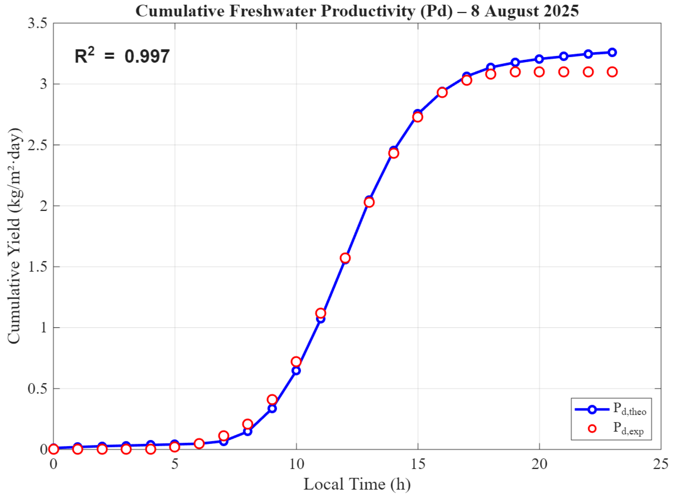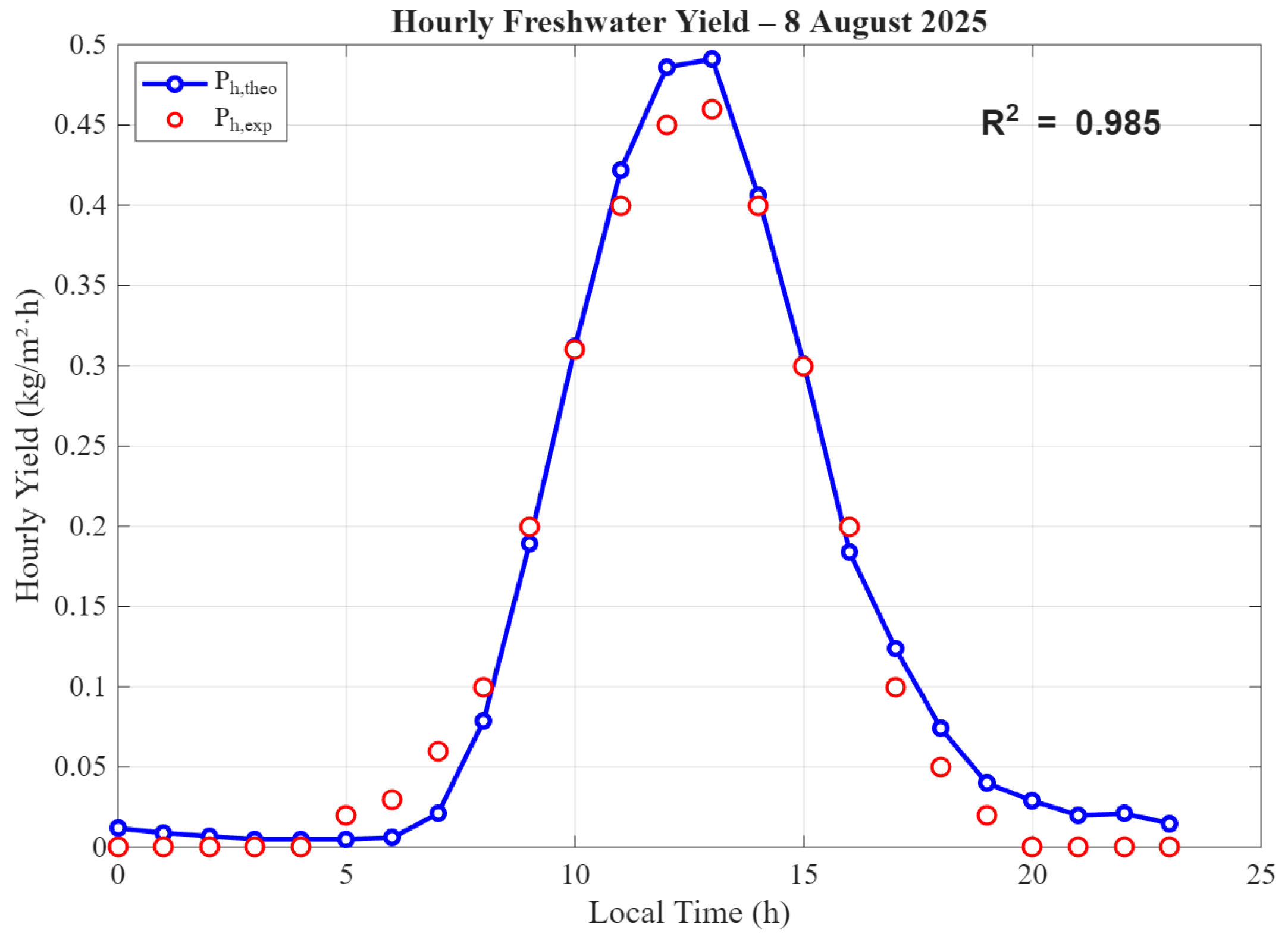 To complement the field data, a theoretical model based on heat and mass transfer balance equations was developed in MATLAB. This model was driven by the same hourly weather inputs recorded on 8 August 2025, enabling a direct comparison between predicted and measured performance. Such validation under real, location-specific operational conditions is crucial, as reliance on generalized climatic data may lead to significant deviations in predicted freshwater productivity [5,26].