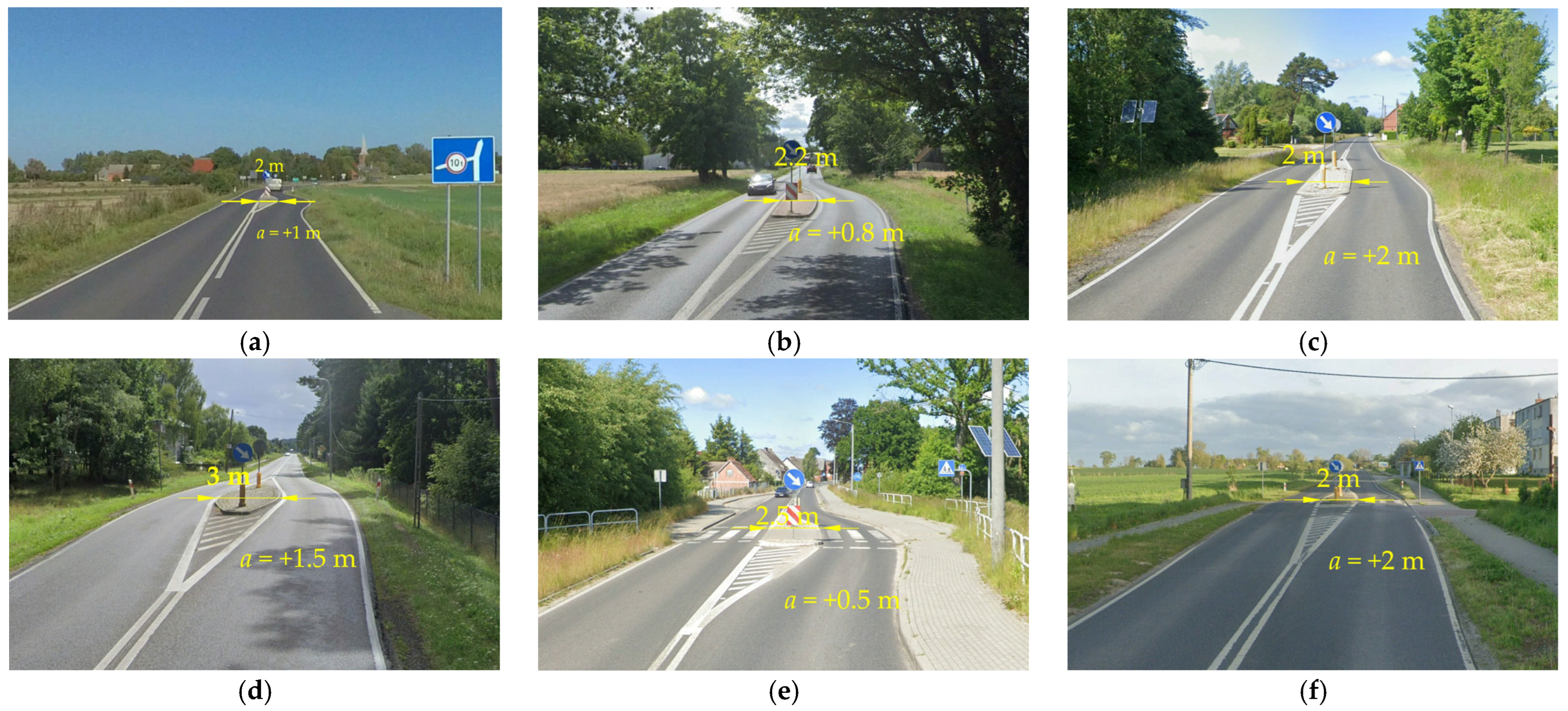 - Sołowczuk, A.; Kacprzak, D. Identification of the determinants of the effectiveness of on-road chicanes in transition zones to villages subject to a 70 km/h speed limit. Energies 2020, 13, 5244. [Google Scholar] [CrossRef]