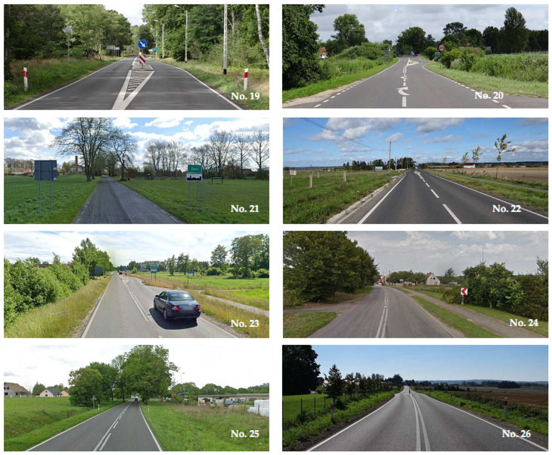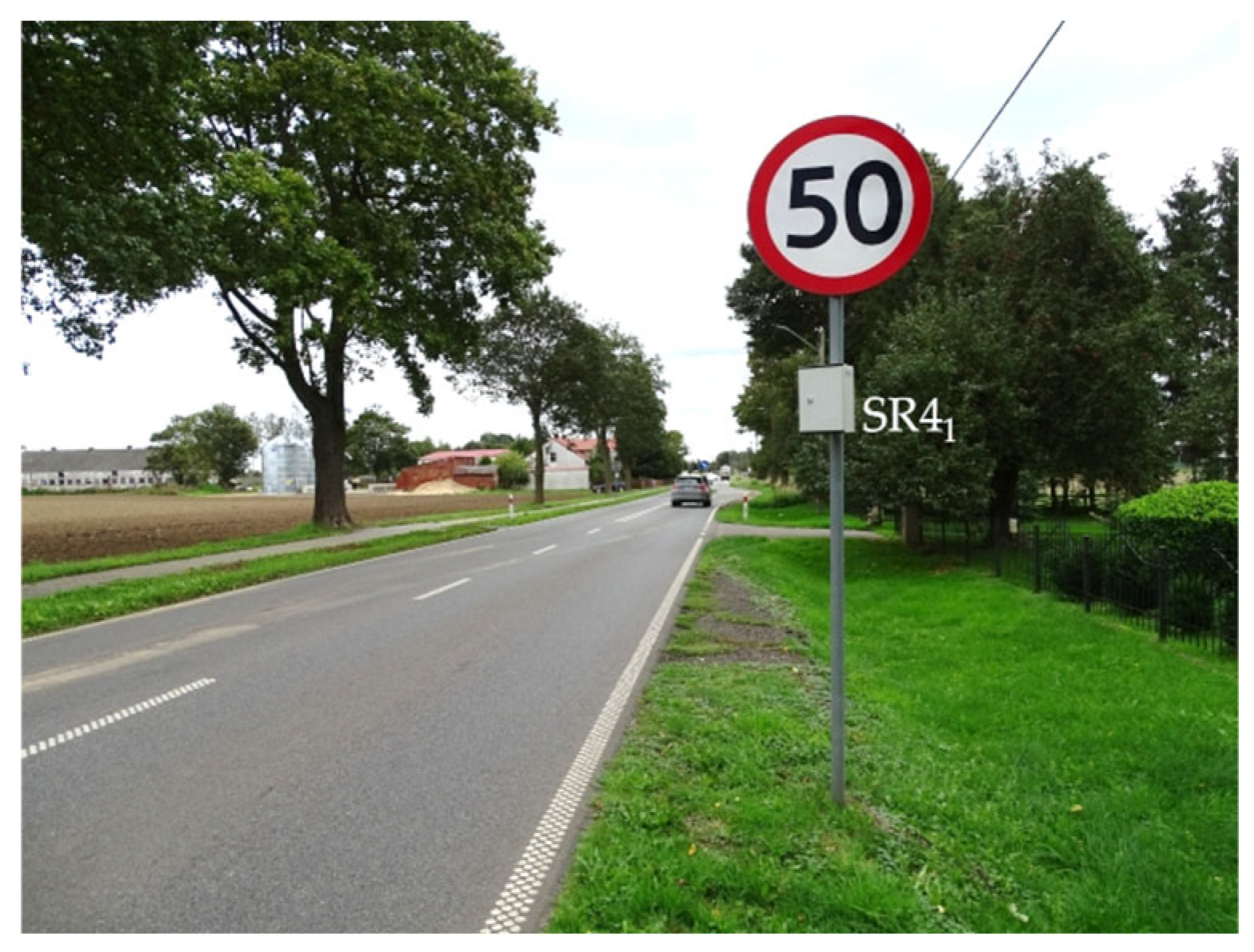 - Majer, S.; Sołowczuk, A. Wpływ na prędkość zagospodarowania otoczenia strefy przejściowej dróg wojewódzkich przy wjeździe do małych miejscowości. In Perspektywy Rozwoju w Naukach Inżynieryjno-Technicznych—Trendy, Innowacje i Wyzwania; Wydawnictwo Naukowe TYGIEL sp. z o.o.: Lublin, Poland, 2024; Chapter 5; pp. 66–92. (In Polish) [Google Scholar]
