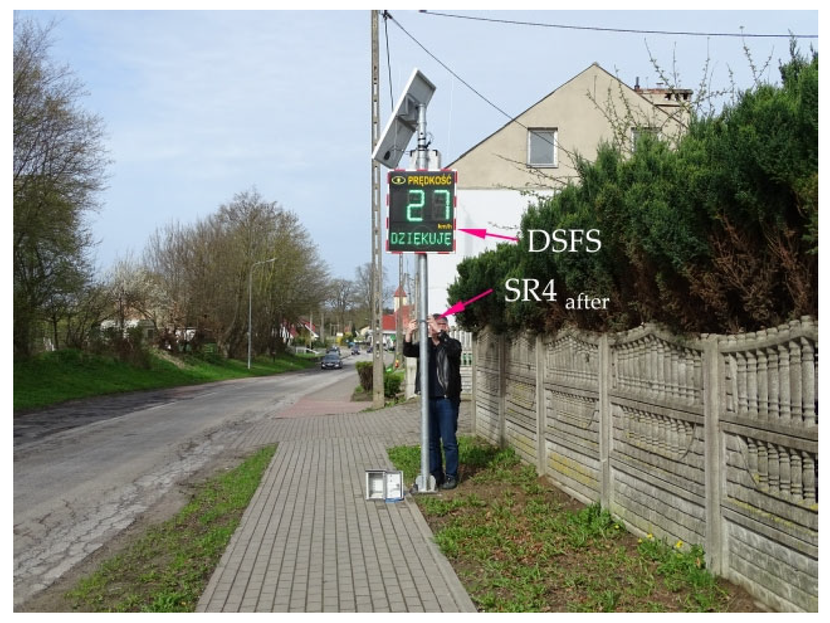 - Radarowe Wyświetlacze Prędkości. Available online: https://systemy-informacyjne.pl/oferta/kategoria/radarowe-wyswietlacze-predkosci/ (accessed on 5 September 2025). (In Polish).