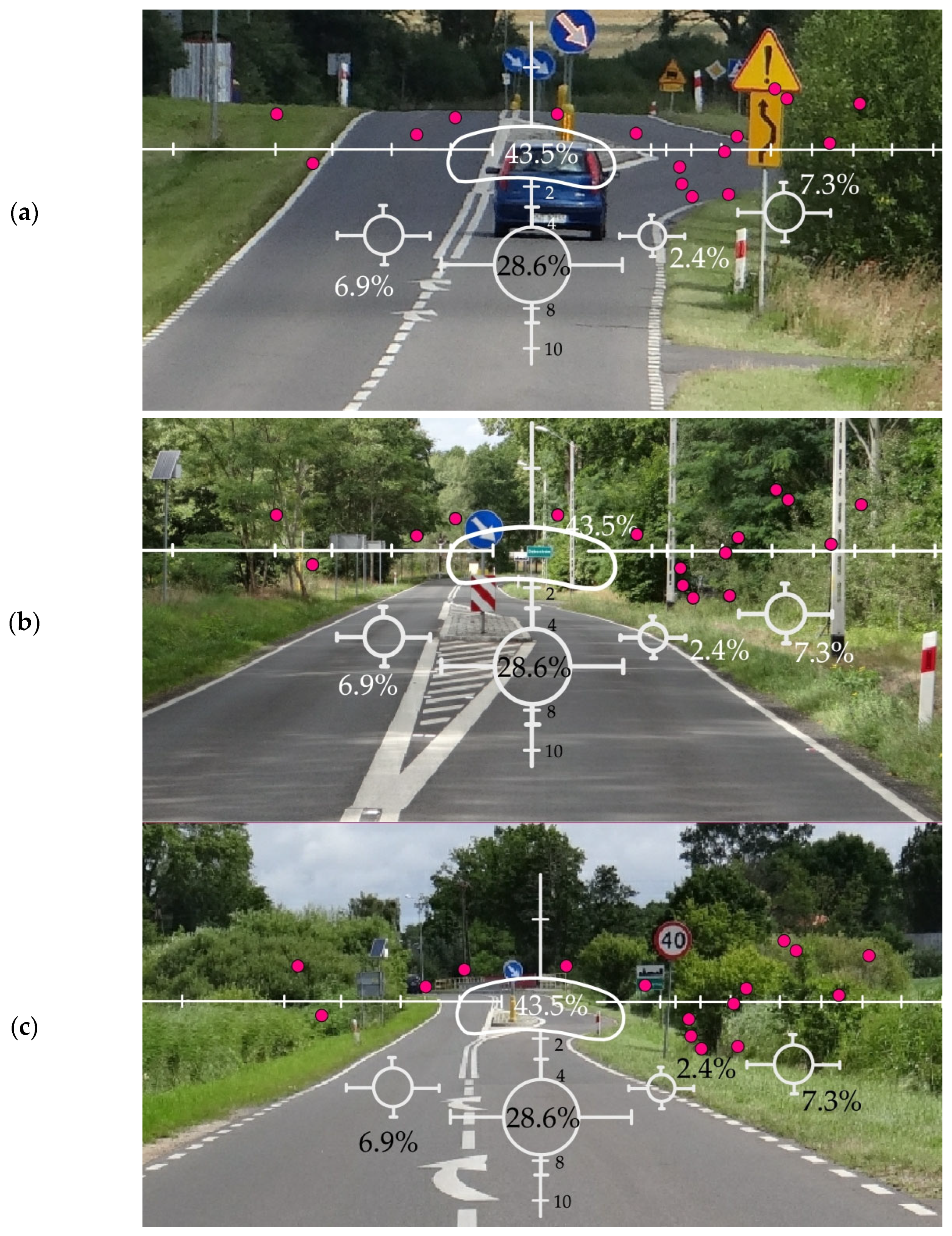 - The view of the road ahead beyond the respective TCM, which included features within the driver’s field of sharp vision, such as a pedestrian refuge, an intersection, a bridge with railings, a culvert with road barriers, forested areas, and agricultural land;