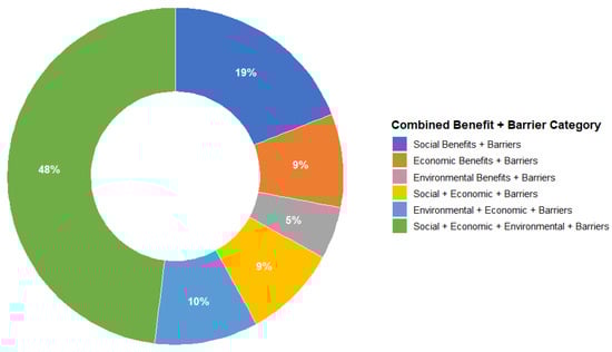 Finally, our analysis also considers those studies which discussed combined benefits, with listing barriers to adoption within them. Out of 148 full text syntheses studies, 19 studies were found to have combined benefits alongside adoption barriers. Our analysis further showed that more than 48% of the analyzed articles included all social, economic, and environmental benefits and barriers. While 19% of articles include social benefits and barriers, followed by 10% in environmental and economic benefits, with barriers. The economic benefits with barriers and socio-economic benefits with barriers were found in 9% of articles. The lowest coverage was found by environmental benefits and barriers in 5% articles, as shown in Figure 6.