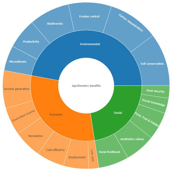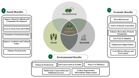 Sustainability is a broad term that is understood as the balanced integration of social, economic, and environmental dimensions. These three dimensions are the major pillars of sustainability, which are interrelated with each other. Social sustainability helps to maintain cultural values, equity, and human well-being. Economic sustainability supports improved livelihoods and profitability, and environmental sustainability provides long-term functioning of natural resources to ensure their availability for future generations [22]. Agroforestry lies at the intersection of these three dimensions and is identified as a sustainable practice as it is environmentally sound, economically viable, and socially accepted. Environmentally, it conserves biodiversity, enhances soil health, improves water quality, sequesters carbon, supports microbial activity, and provides habitat for pollinators, such as bees, thereby enhancing food security [23,24,25,26]. Economically, it provides diversified income sources from the trees, which yield fruits, fuelwood, fodder, and timber, offering a stable income to farmers [27]. Providing diverse resources such as food, fiber, and fruits not only preserves natural resources but also enhances the economic growth of communities [28,29,30]. Furthermore, it reduces the economic risk associated with crop failure and supports long-term crop productivity [31]. Socially agroforestry also strengthens rural communities by improving food security, increasing productivity, enhancing rural livelihoods, offering a stable income, and enhancing resilience against climate challenges [32,33,34]. Agroforestry provides a deeper connection between people and their land, promoting long-term sustainability in agricultural practices [34]. As a sustainable alternative to conventional farming, agroforestry reduces environmental degradation while maintaining productivity. It supports ecosystem services, conserves natural resources, and improves the livelihoods of smallholder farmers, particularly in rural areas [24,35]. By integrating different elements of the landscape, agroforestry creates a balanced system that benefits the environment, society, and the economy [36]. Its ability to enhance both agricultural sustainability and rural development makes it an emerging solution for ensuring long-term food security and ecological balance [16,33]. Agroforestry is particularly effective in agricultural lands that are vulnerable both environmentally and economically. By offering benefits that enhance soil health, biodiversity, and rural livelihoods, agroforestry has the potential to address key sustainability challenges while also encouraging farmers to adopt more resilient land use practices [7,27,37,38,39]. Approximately half of the developing countries employ some agroforestry practices to mitigate the effects of climate change [40]. Hence, it is not incorrect to state that agroforestry is adopted universally, but its benefits are highly dependent on temporal and spatial scales [41]. Over the past few decades, numerous studies have demonstrated the multiple benefits of agroforestry. However, those studies showed specific benefits of agroforestry. Their research has primarily focused on either the social, economic, or environmental benefits of agroforestry, often treating these aspects separately [6,38,42,43,44]. Several reviews on agroforestry have been done already, but they are limited in scope and synthesize findings only from the perspective of either social, economic, or environmental benefits [44]. The overall socio-economic and environmental benefits of agroforestry remain scattered and unclear [7,27,44]. Therefore, an integrated assessment of all three dimensions is necessary.