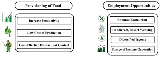 Approximately 37% of U.S. crop yields were damaged by pests, while 20–40% of global crops were lost because of diseases [117]. Chemical pesticides dominate the control of diseases and pests. However, they have various impacts on human health, are expensive, and contribute to the development of resistance, supporting the outbreak of dangerous pests. Therefore, chemical control is neither economically nor environmentally sustainable. Adopting agroforestry promotes the use of natural enemies of pests and diseases as eco-friendly alternatives, thereby reducing crop loss while minimizing environmental harm. Agroforestry reduces the need for expensive inputs, such as fertilizers and pesticides, thereby lowering production costs and improving farm profitability [118]. Agroforestry provides diverse habitats, which limit the spread of pests, weeds, and diseases, thereby reducing crop damage while minimizing the need for heavy pesticide use [68]. Lower pest abundance and damage are observed in perennial agroforestry systems, mainly due to shading and landscape complexity [119]. Trees in agroforestry systems serve as habitats for various species of biodiversity, which act as natural predators, further controlling harmful pests and minimizing the need for pesticides. Trees, hedges, and windbreaks act as physical barriers, controlling pests carried by the wind [120]. Soil microbes in AFS help suppress pathogens, and tree shading reduces disease incidence by modifying microclimates [121]. Agroforestry systems promote natural predators of pests, thereby boosting biocontrol and increasing biodiversity [25]. For example, a research study in Bangladesh shows that by growing Piper chaba (a biocontrol plant) together with several popular tree species, farmers become more financially stable [76]. Agroforestry is a key in providing a ‘win-win’ relationship between crop yield and biocontrol methods [24]. Furthermore, it can provide sources of adult parasitoid food, mating sites, rest and oviposition, and host plant distributions, utilizing techniques such as trap crops/repellent crops [106]. Hence, by reducing input costs and providing a cost-effective approach to control disease and pests, agroforestry seems to be a sustainable farming solution. Figure 9 provides the synthesized economic benefits of agroforestry systems from reviewed articles.
