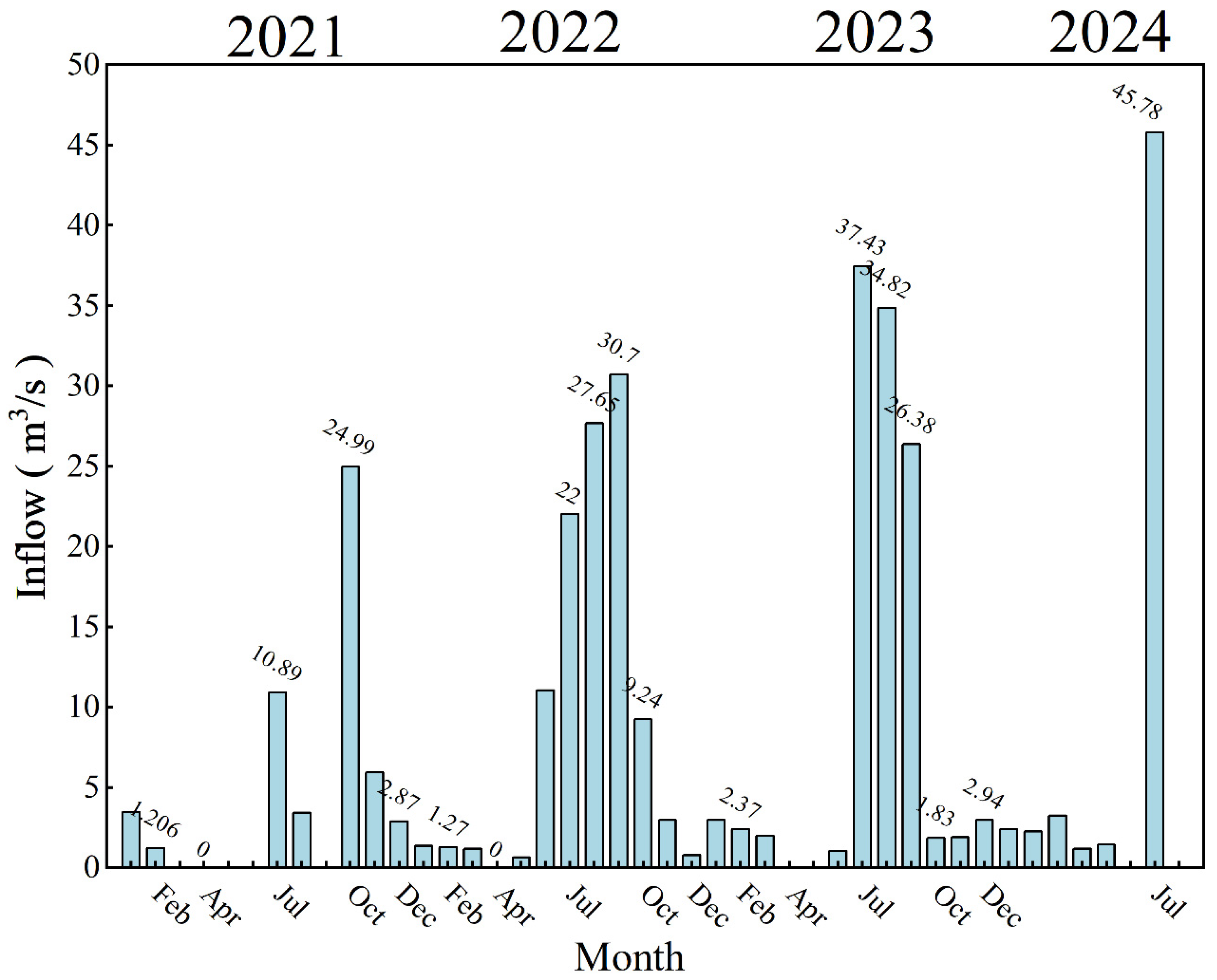 - Wet Season (September–October 2023)—This period, which is marked by the transition from flood to normal flow conditions, is characterized by sharp inflow fluctuations and is considered highly representative of wet-season dynamics. The corresponding sediment concentration was 1.56 kg/m3, with an initial water level was 398.68 m. The sluice openings at the west and east outlets were 0.95 m and 0.27 m in September, and 0.14 m and 0 m in October, respectively.