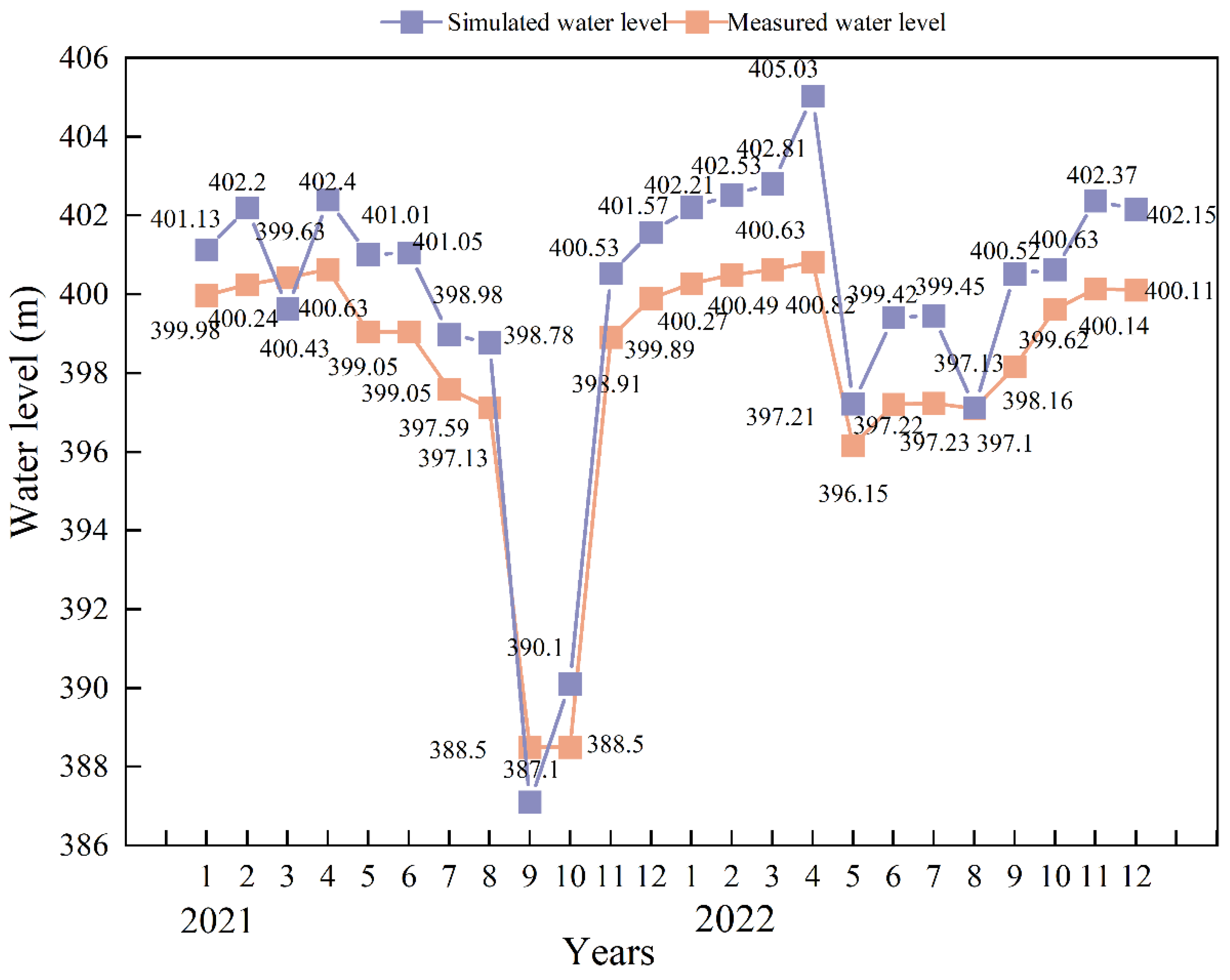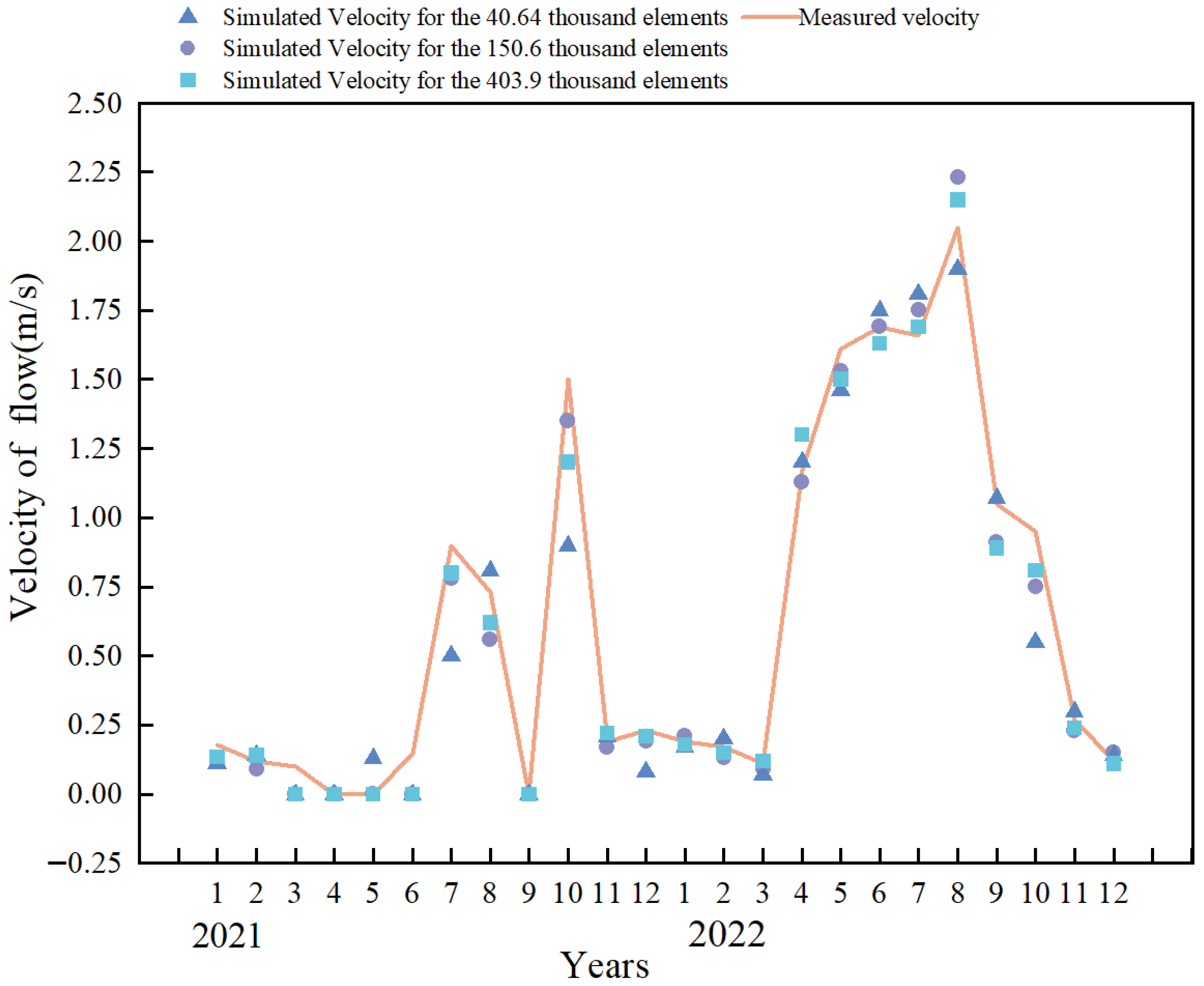 - Dry Season (February–March 2021)—This interval exhibits consistently low inflow rates, closely reflecting actual dry season reservoir operations. The measured sediment concentration was 0.035 kg/m3, with an initial water level of 400.02 m. The sluice openings at the west and east outlets were 0.17 m and 0 m in February, and 0.15 m and 0 m in March, respectively.