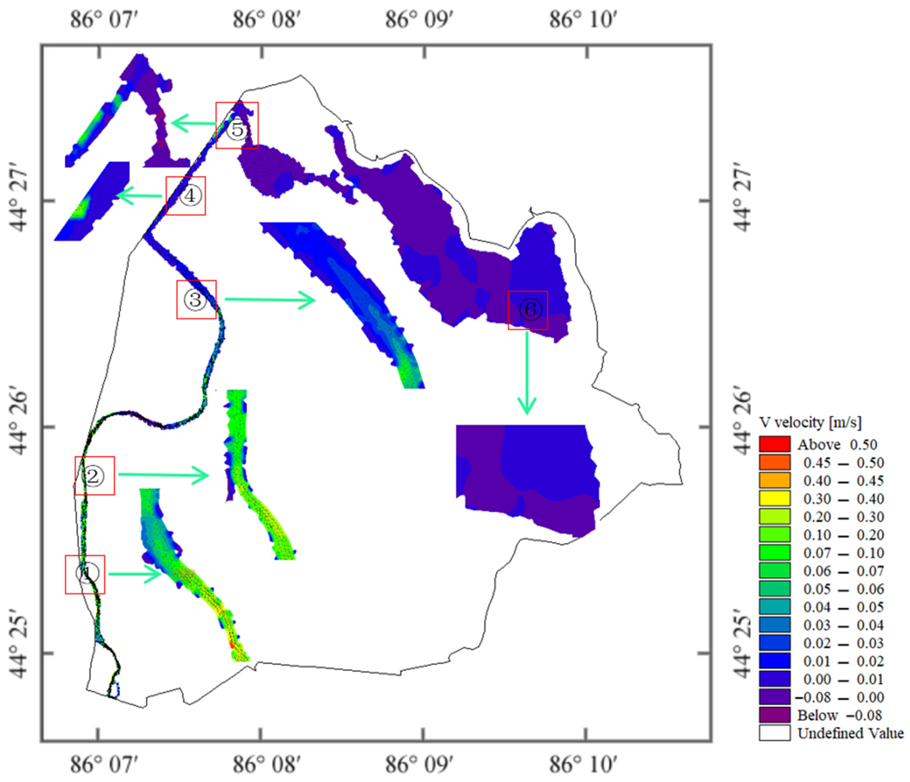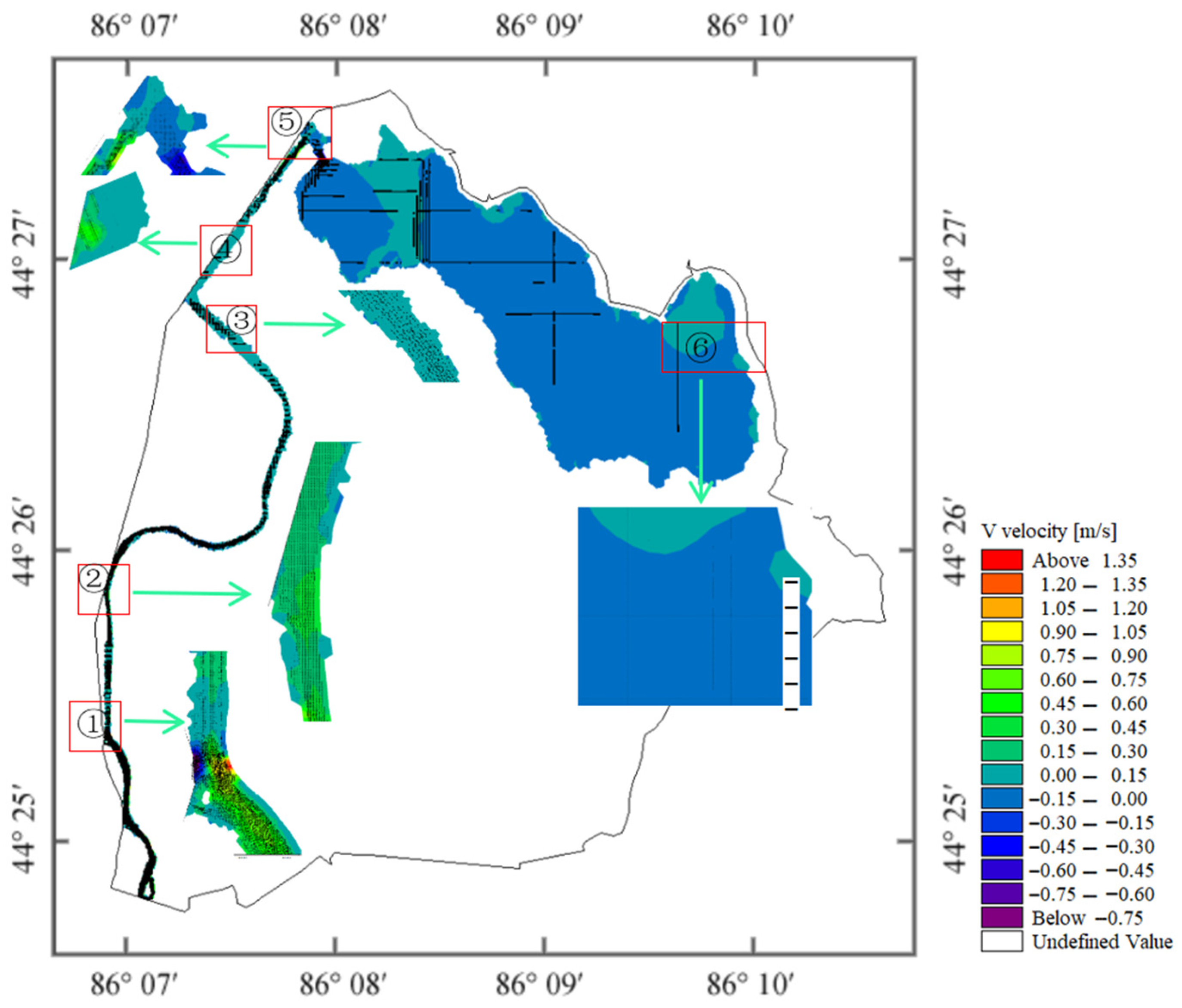 - Liu, X. Three-Dimensional Simulation on Diversion and Sand Dischargecharacteristics of a Typical Bend Channel Head Under Multi-Sedimentenvironment. Master’s Thesis, Shihezi University, Xinjiang, China, 2024. [Google Scholar]
