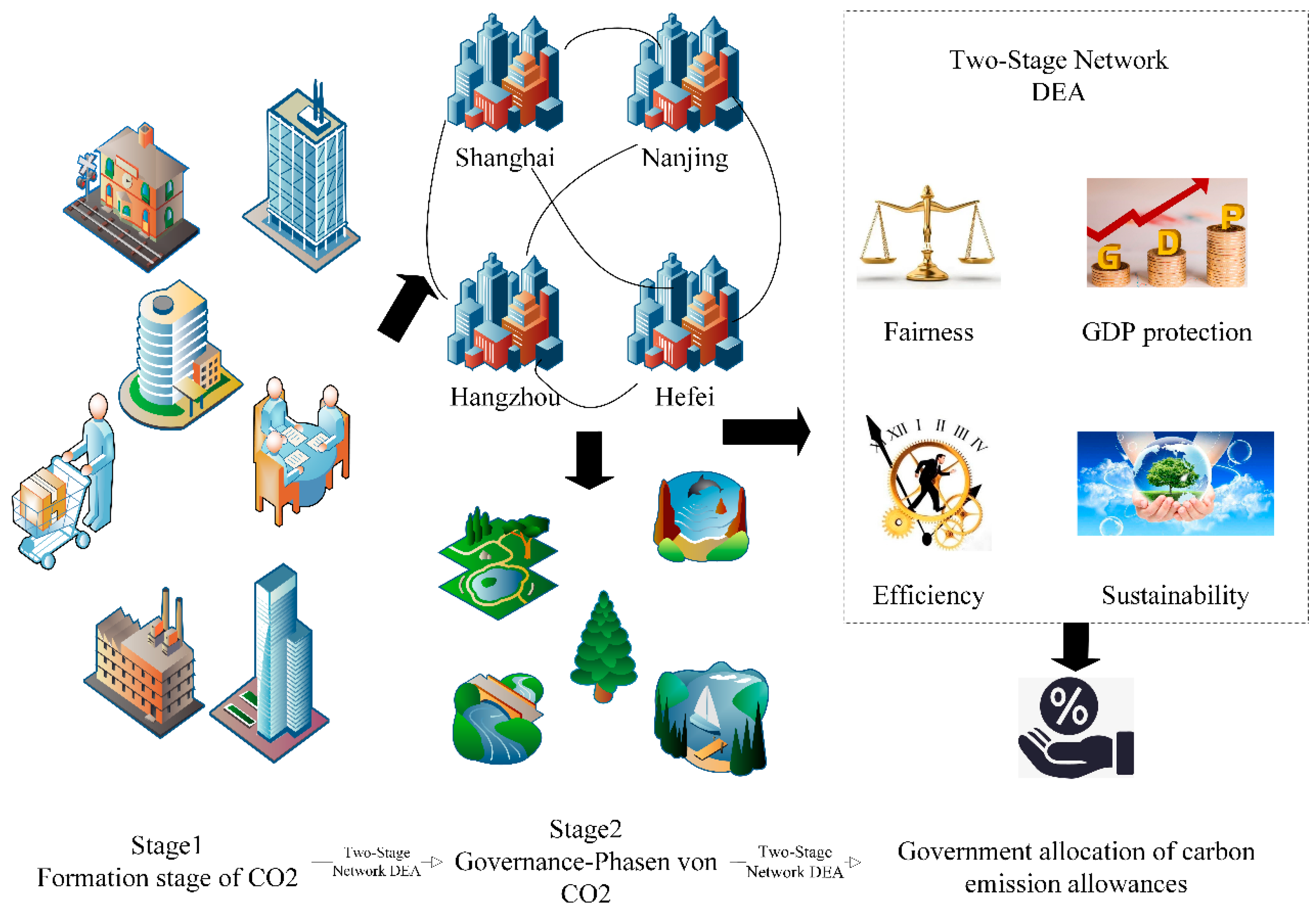 21]. Efficiency is typically evaluated via methodologies such as Data Envelopment Analysis (DEA), whereas equity seeks to balance the interests of diverse social groups, regions, and generations. Yet, reconciling these dual objectives remains a formidable challenge in practice. Most existing models adopt single-stage allocation approaches that neglect the dynamic interactions and spatial heterogeneity of carbon emissions across regions and cities [