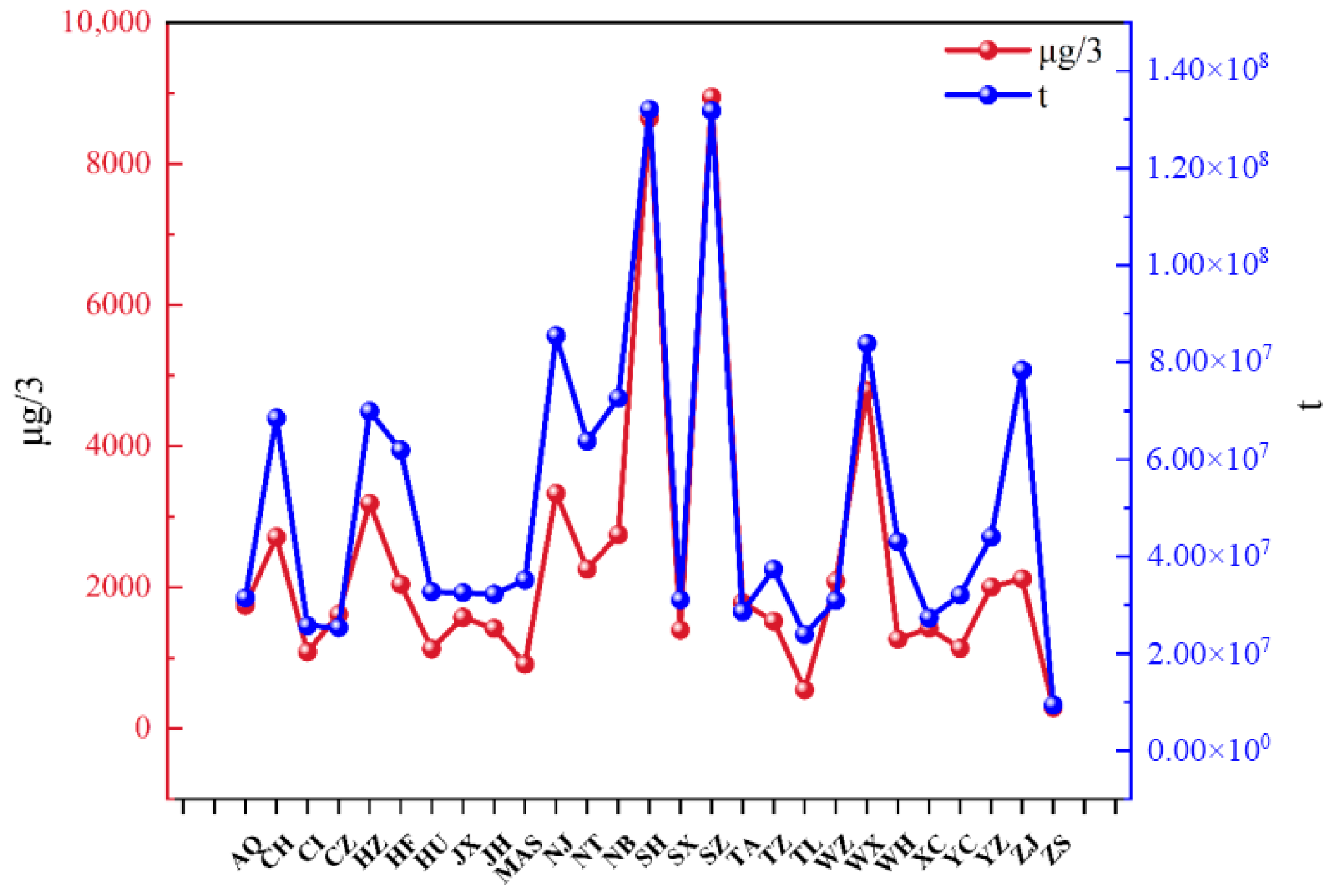 Figure 4 represent the abbreviation of the name of each city. The left vertical coordinate is the one-month CO