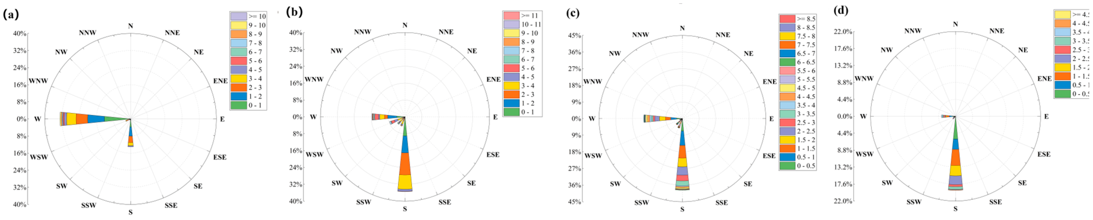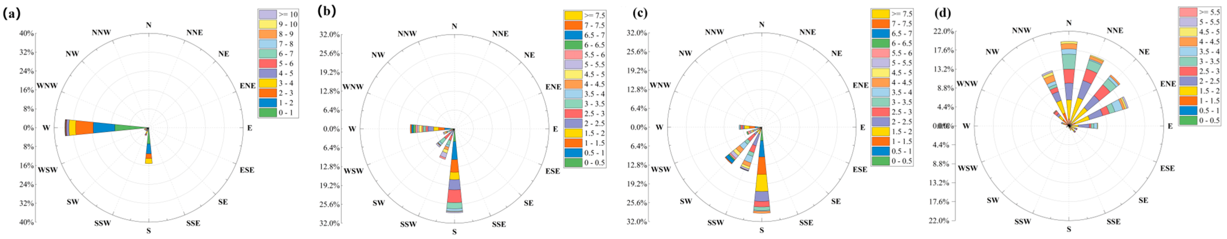 Shanghai Seasonal Wind Map. The four subgraphs (a–d) correspond to winter, spring, summer, and autumn, respectively. The radial direction indicates wind direction (e.g., NNW = north-northwest, SSE = south-southeast), and the percentage labels represent the frequency of each wind direction.