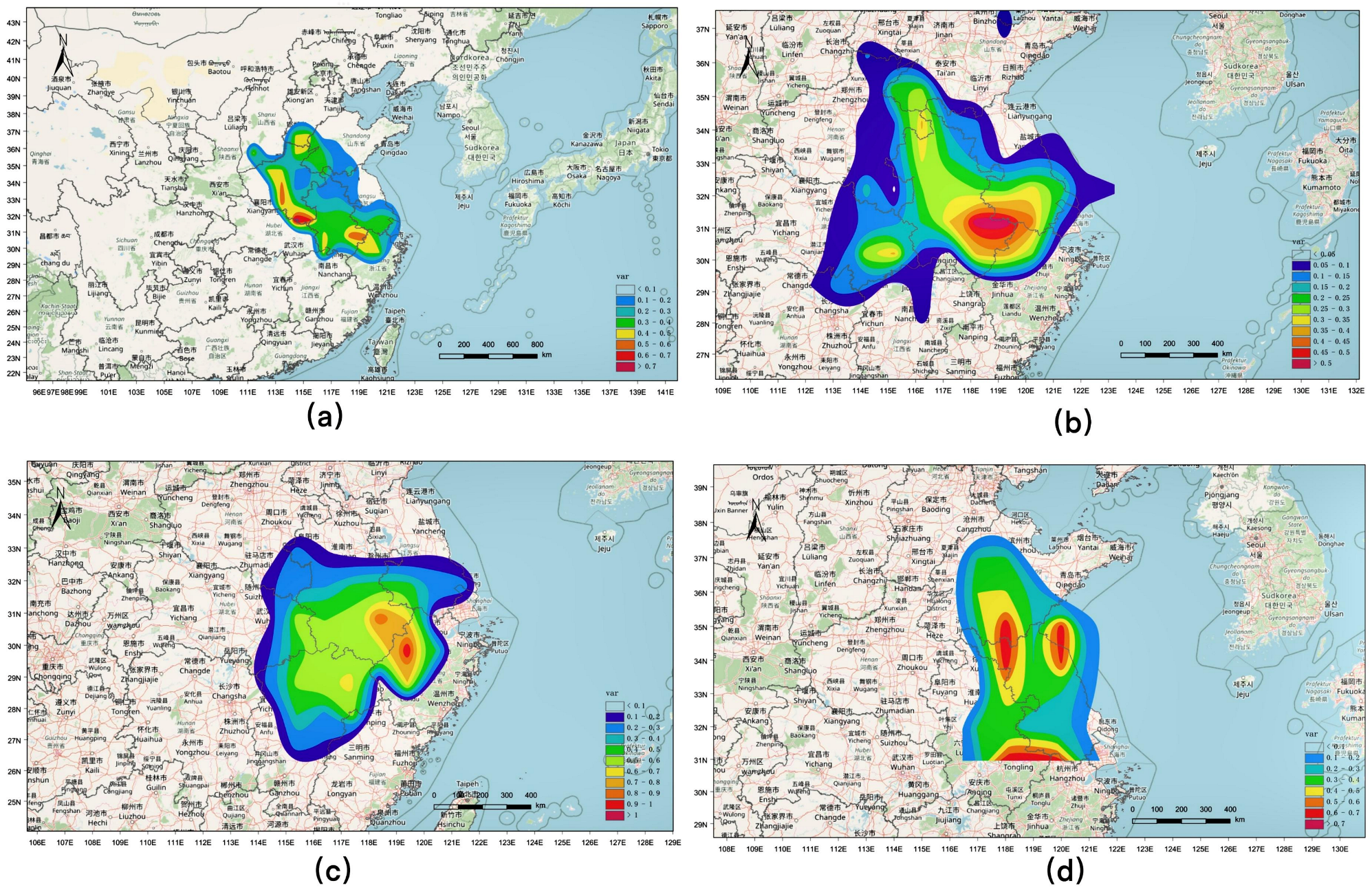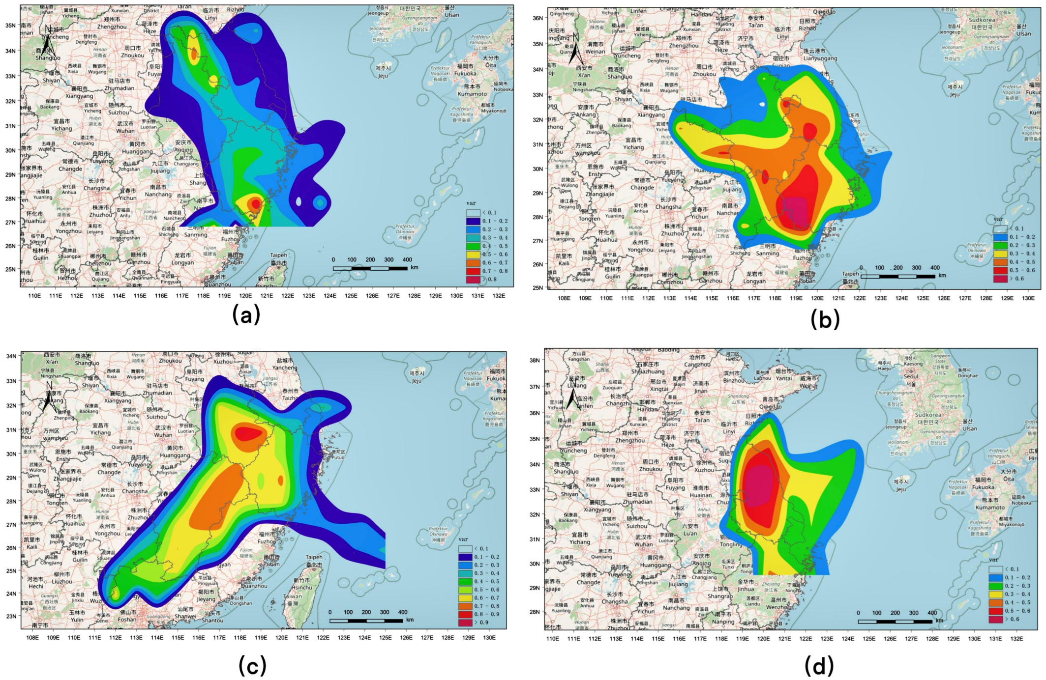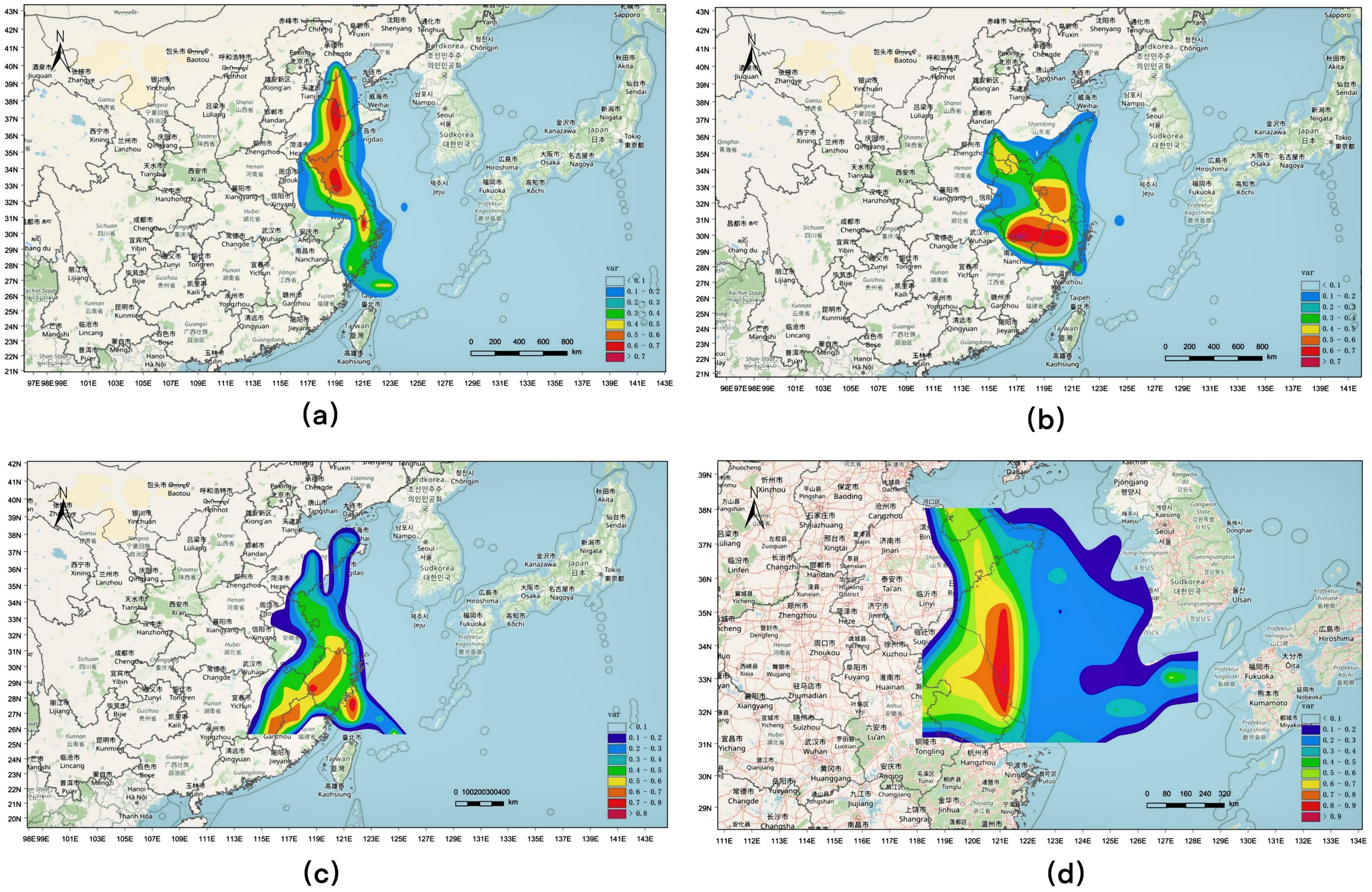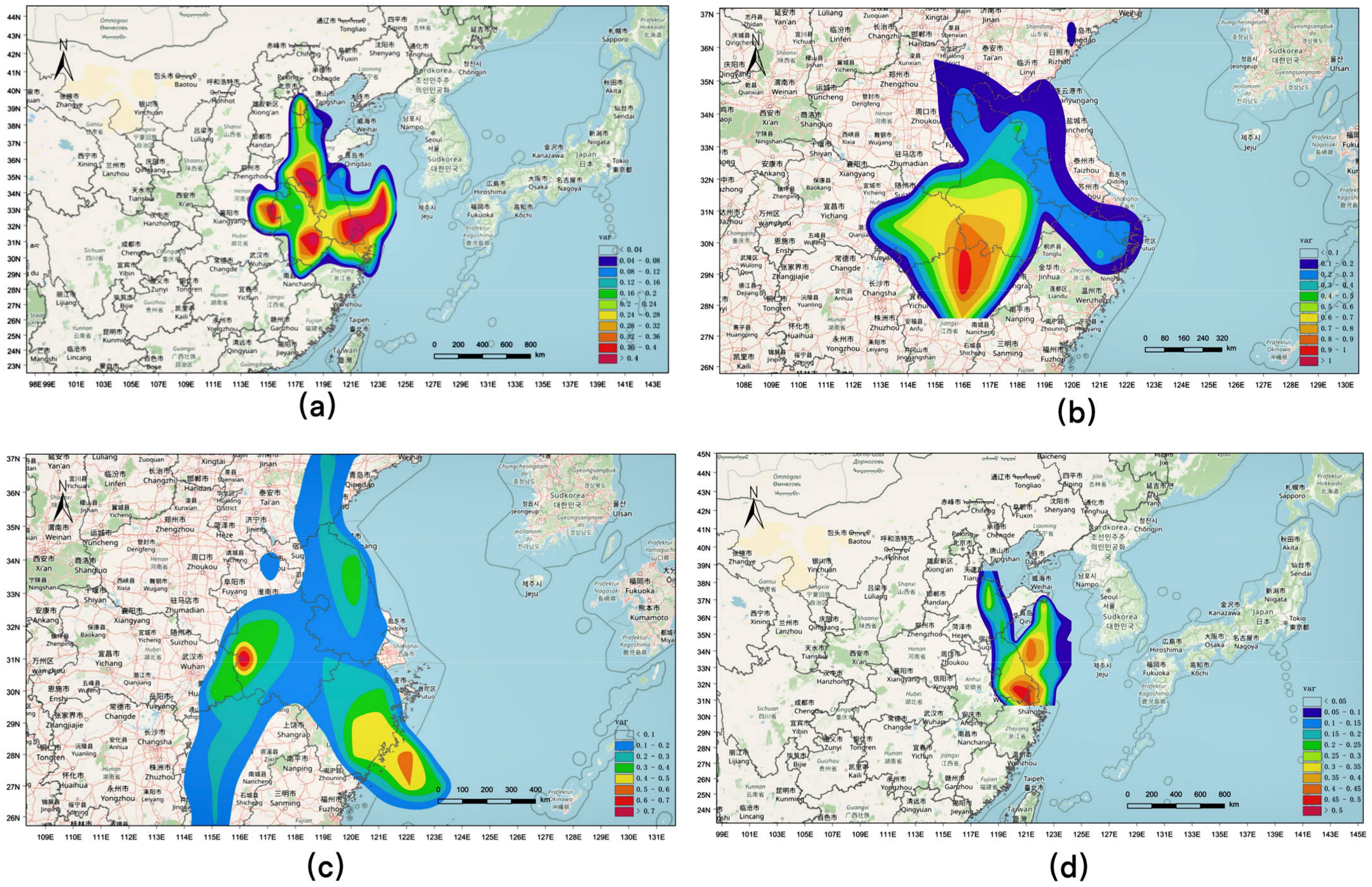 CO2 interaction scope map of Nanjing. The four subgraphs (a–d) correspond to winter, spring, summer, and autumn, respectively.