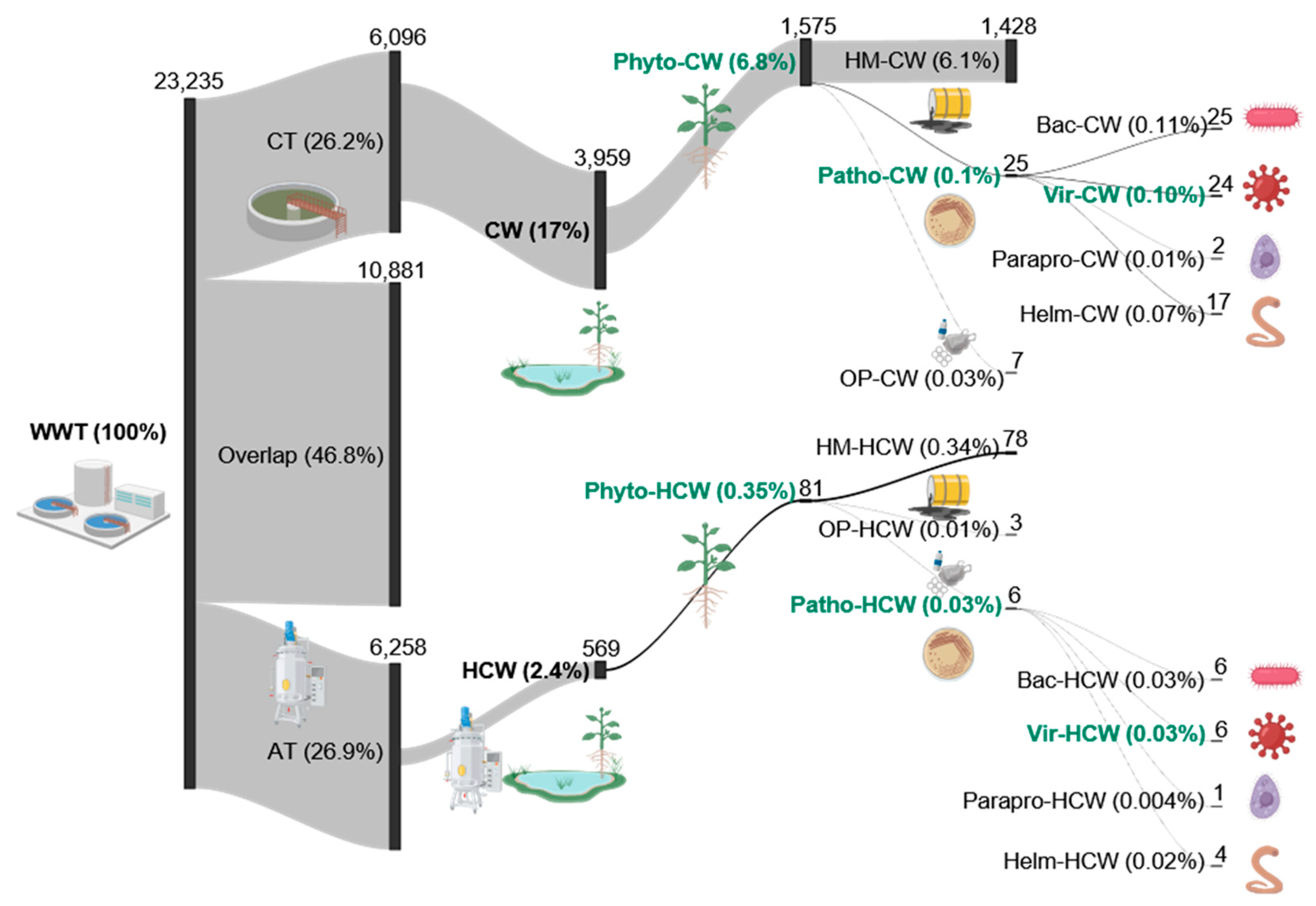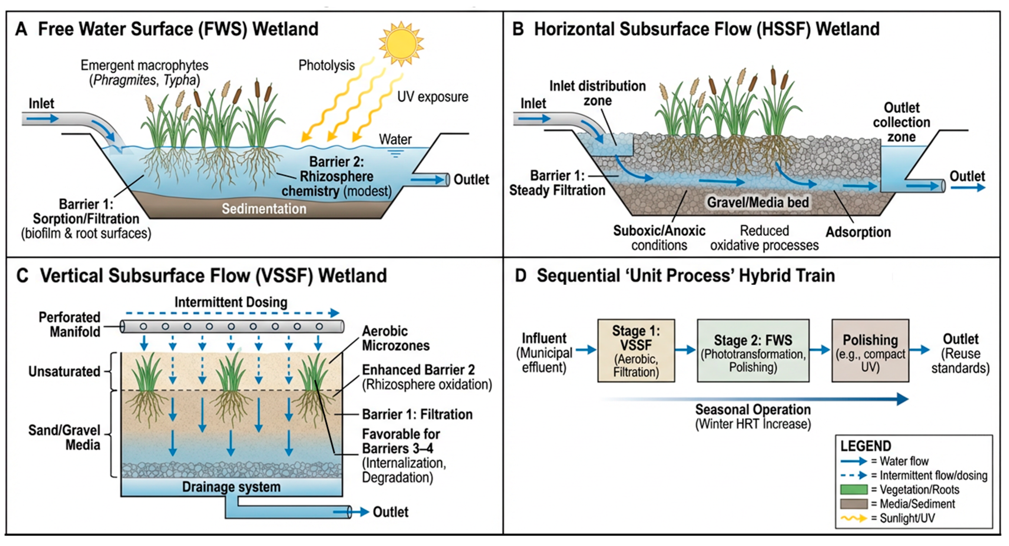 - To what extent can hybrid systems that integrate CWs with complementary technologies (e.g., filtration, disinfection, advanced oxidation) close the performance gap between nature-based and high-energy engineered solutions for viruses at field scale?