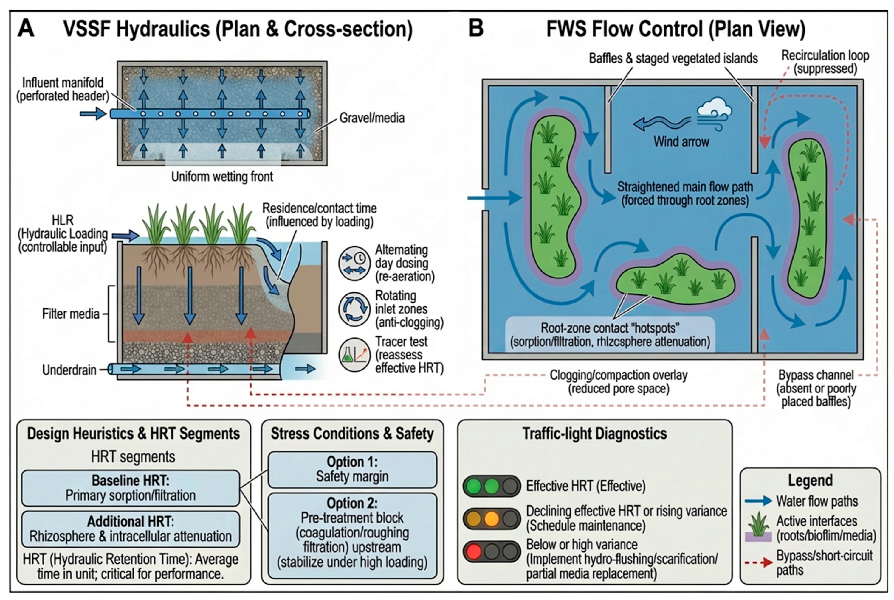 | HRT requirement (d) | ~3–6 d for viral attenuation; ideal ~5–10 d | ~2–4 d for metal sorption equilibrium | virus: ~1–2 log10 per stage; metal: ~70–100% removal | flow uniformity, aeration regime, recirculation, temperature effects | hybrid wetland + UV, VSSF units | [88,103] |