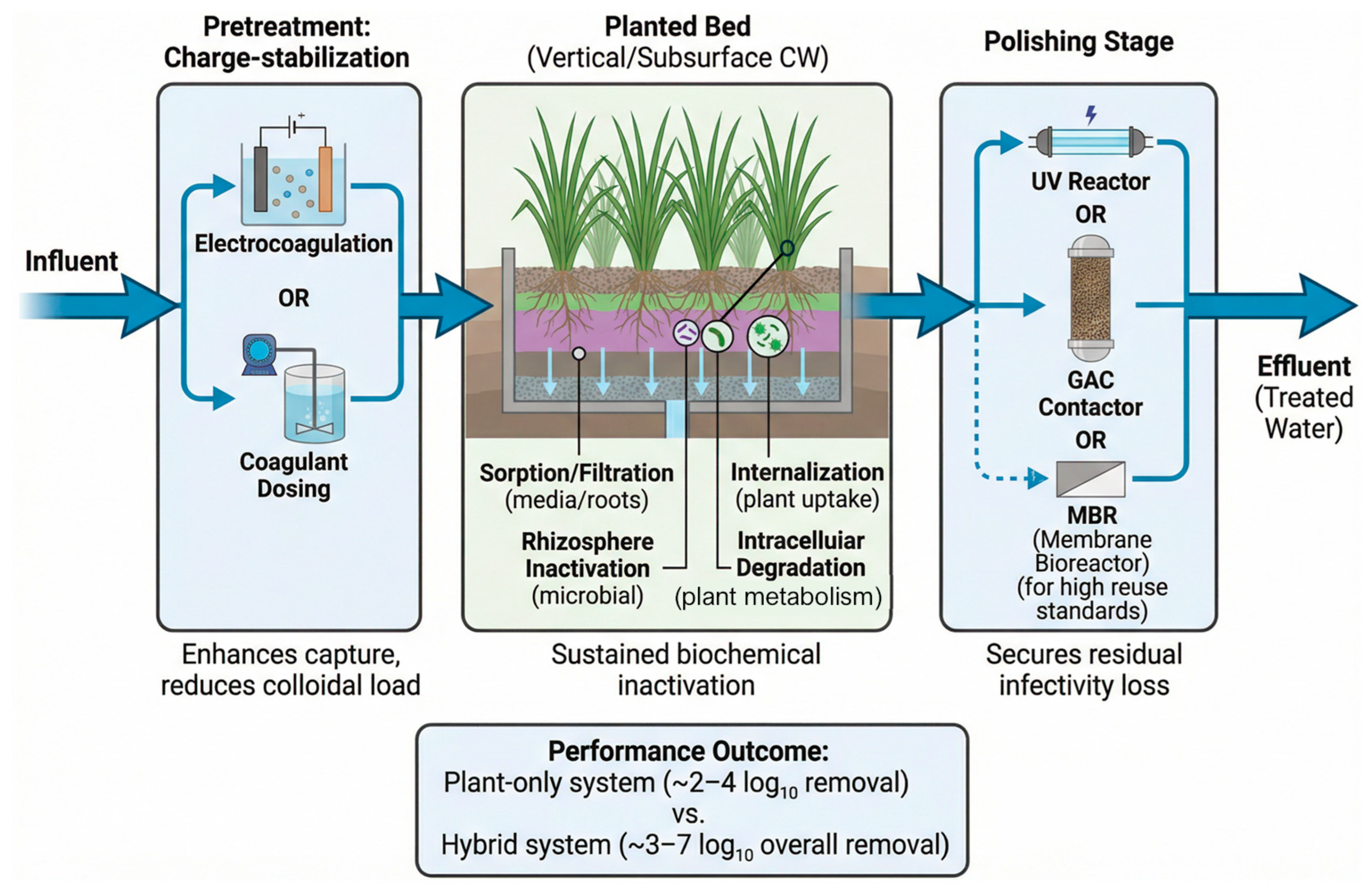 - Gentle pretreatment: Pairing plant stages with mild pretreatment that enhances early viral capture without damaging roots or biofilms, such as low-dose electrocoagulation or optimized coagulation to neutralize charge and aggregate virions before root zone contact, improves first-barrier performance, particularly under high DOC or low temperatures [152,153,154].