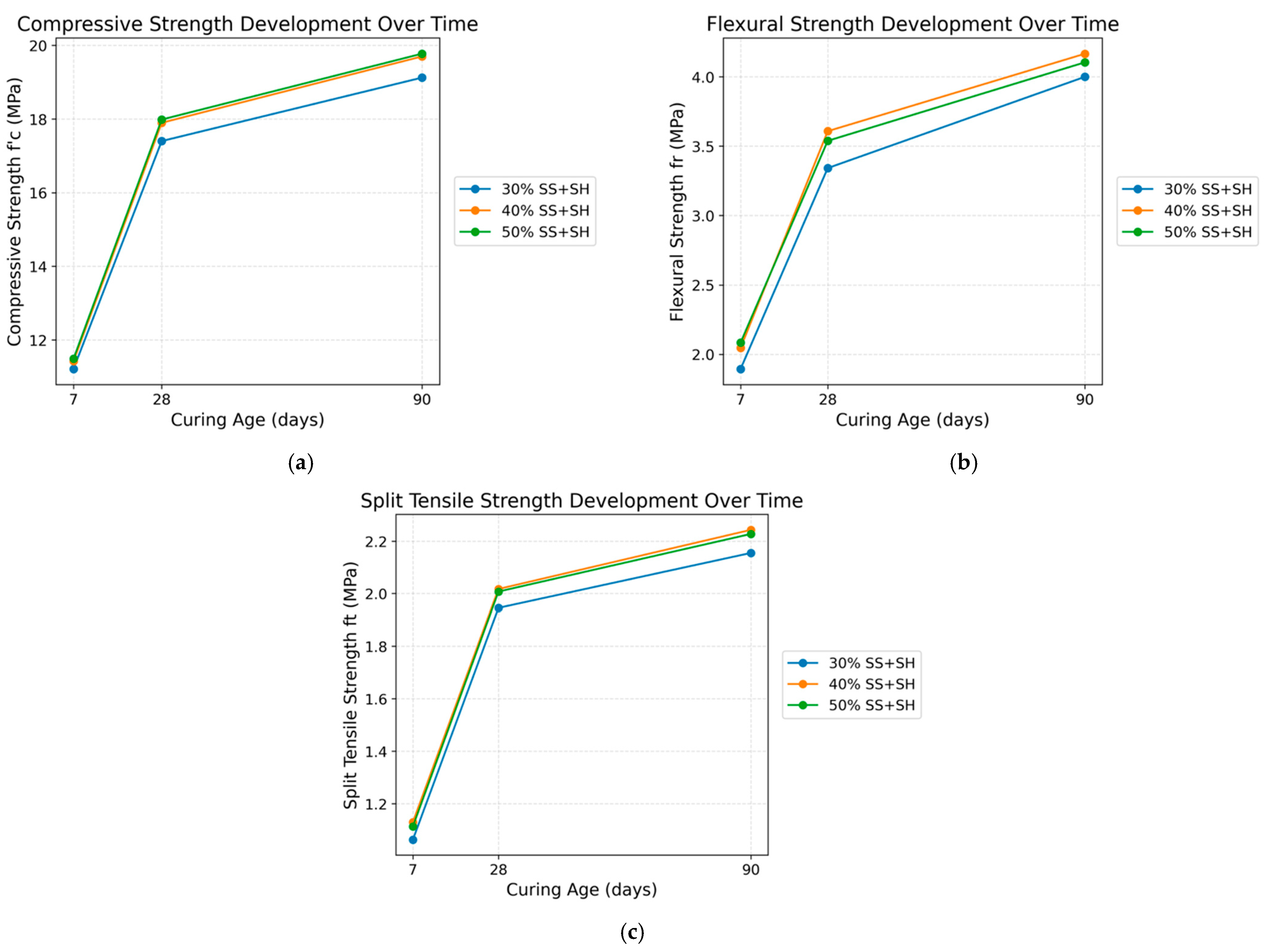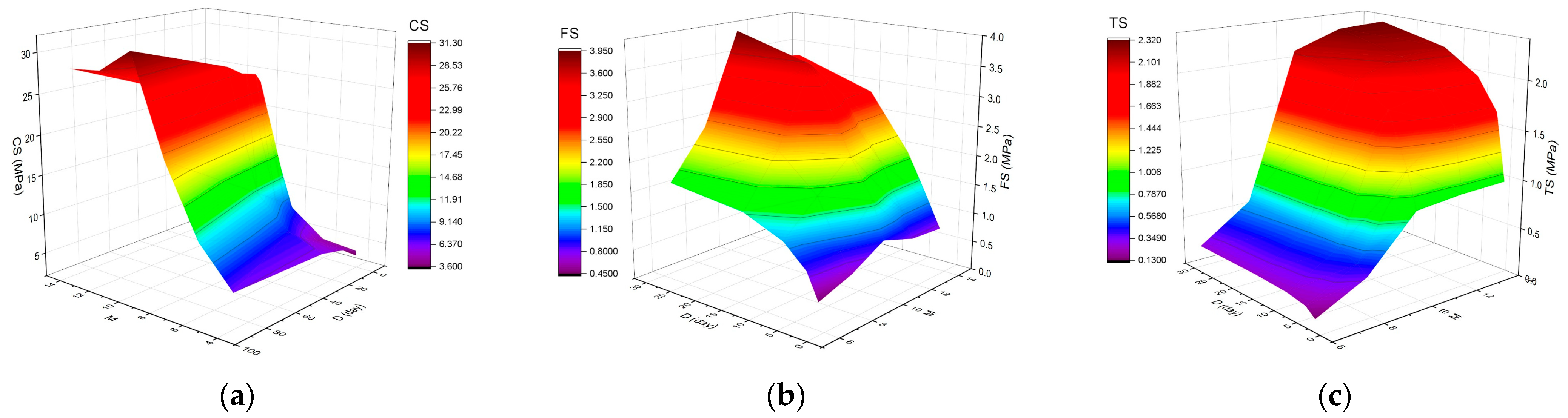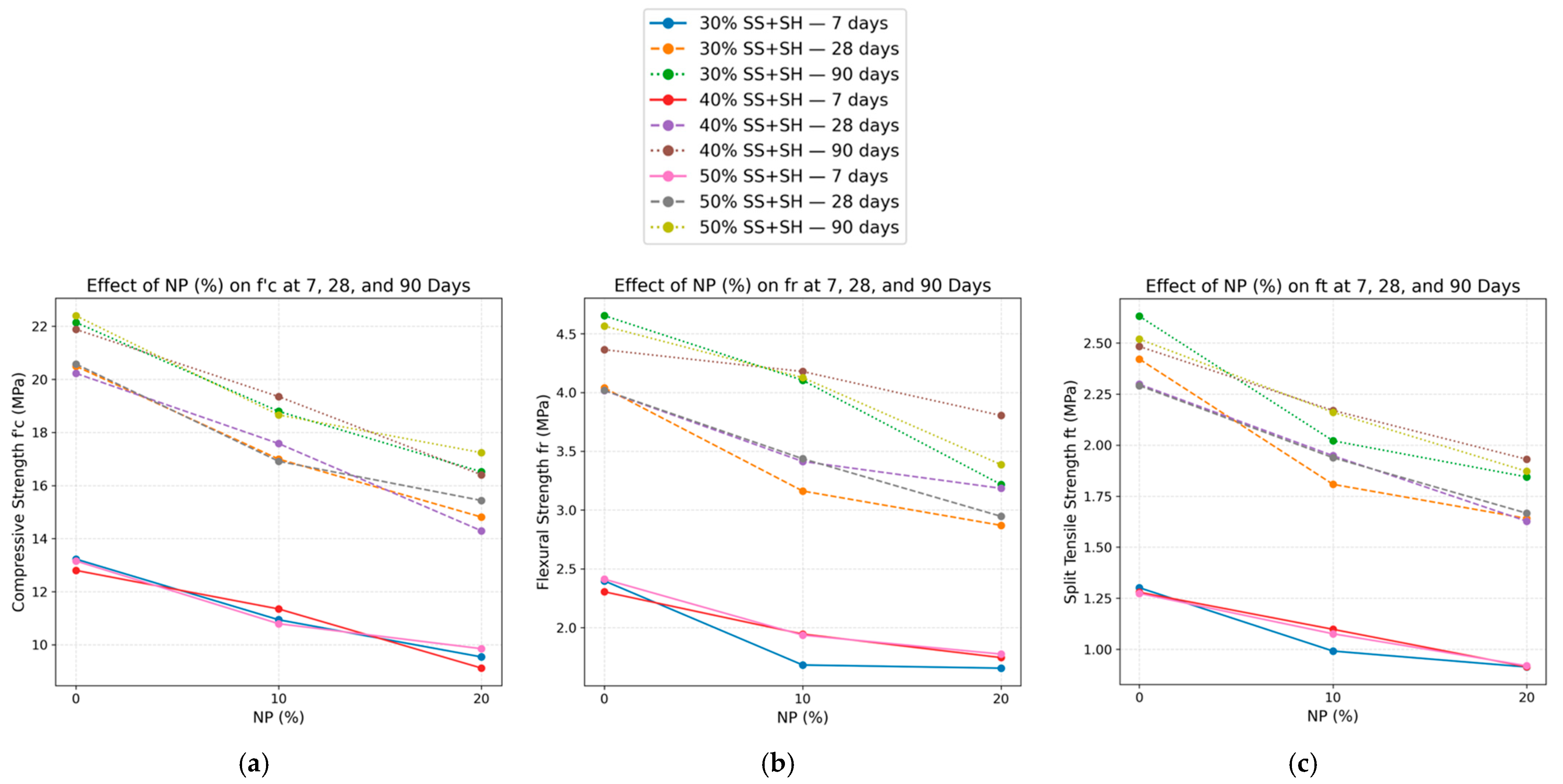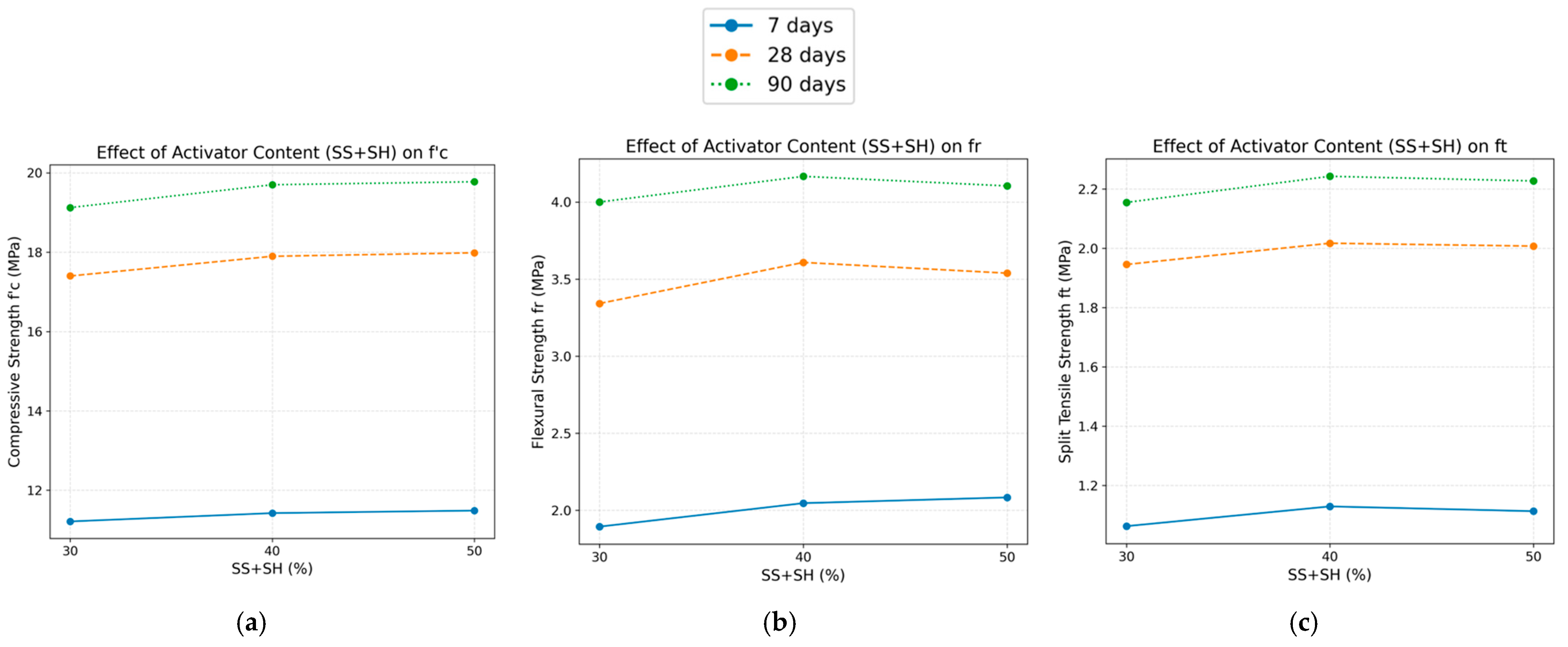 3.3. Effect of Alkali Activator Content (SS + SH) on Mechanical Strength