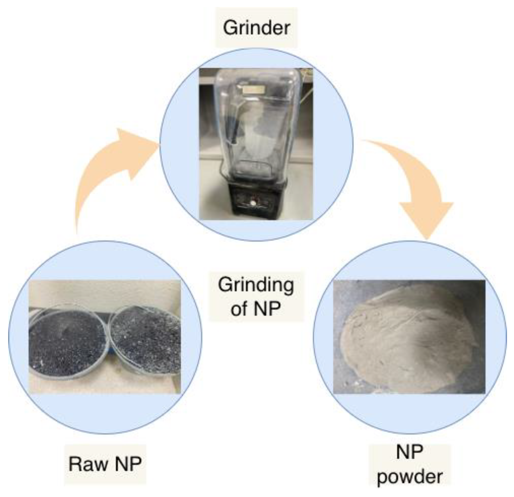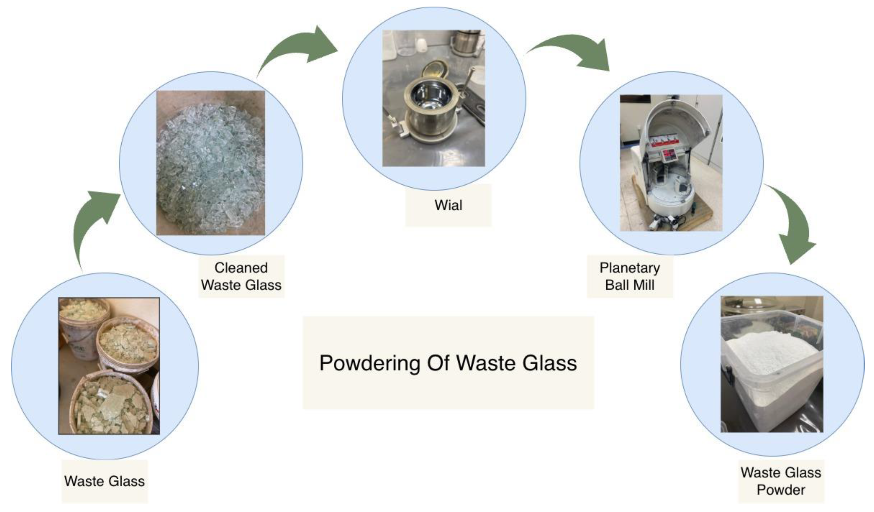 - Odaa, S.A.; Al-Hadithi, A.I.; Mansoor, Y.A. Preparation and Characterization of Nano-Waste Glass Powder. Results Mater. 2023, 20, 100470. [Google Scholar] [CrossRef]