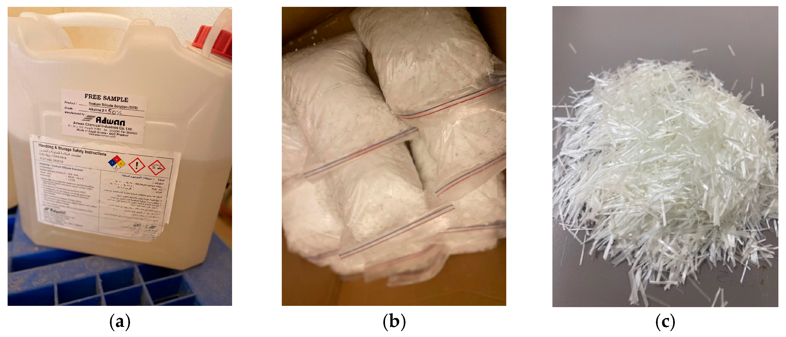 - Ahmad, S.; Khalid, H.R.; Shaqraa, A.A.; Bahraq, A.A.; Maslehuddin, M.; Al-Dulaijan, S.U. Properties of Natural Pozzolan-Based Geopolymer Concrete: Effects of Natural Pozzolan Content, Type of Alkaline Activator, and Silicate/Alkali Ratio. Eur. J. Environ. Civ. Eng. 2023, 27, 356–373. [Google Scholar] [CrossRef]
