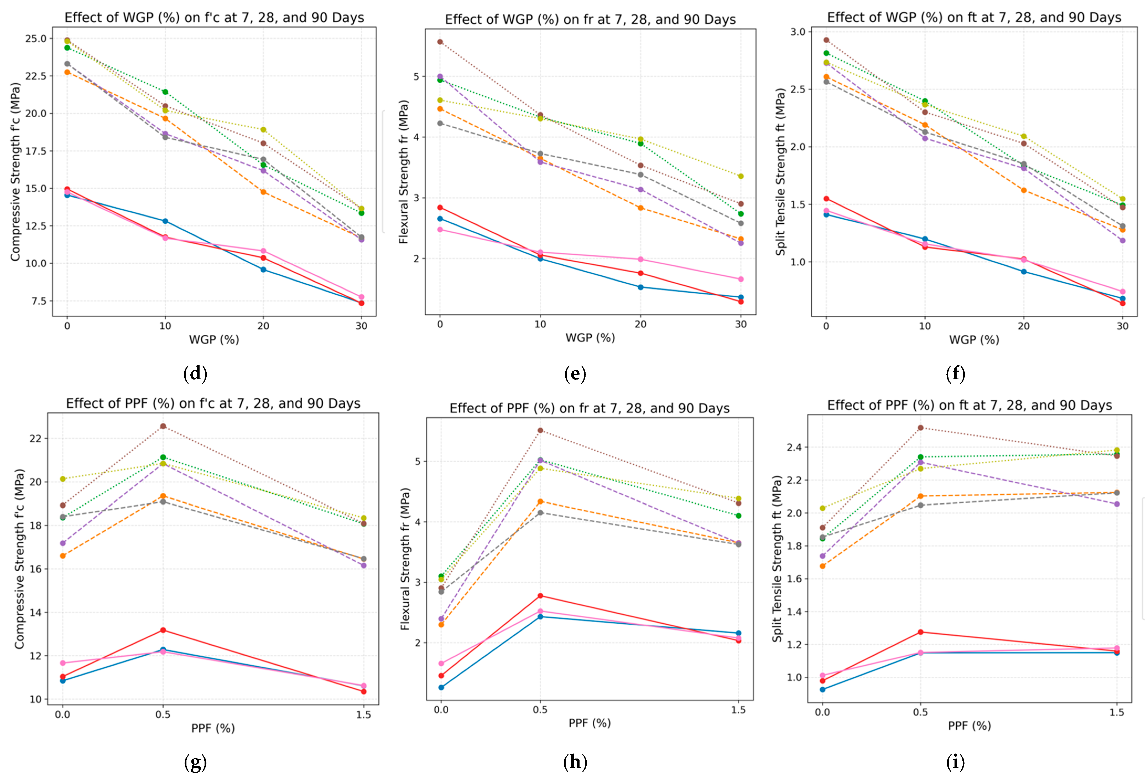 - A more steady and significant strengthening effect is observed when replacing cement with WGP. Lower levels of WGP (10–20%) maintain acceptable mechanical performance while enabling cement reduction for sustainability purposes.