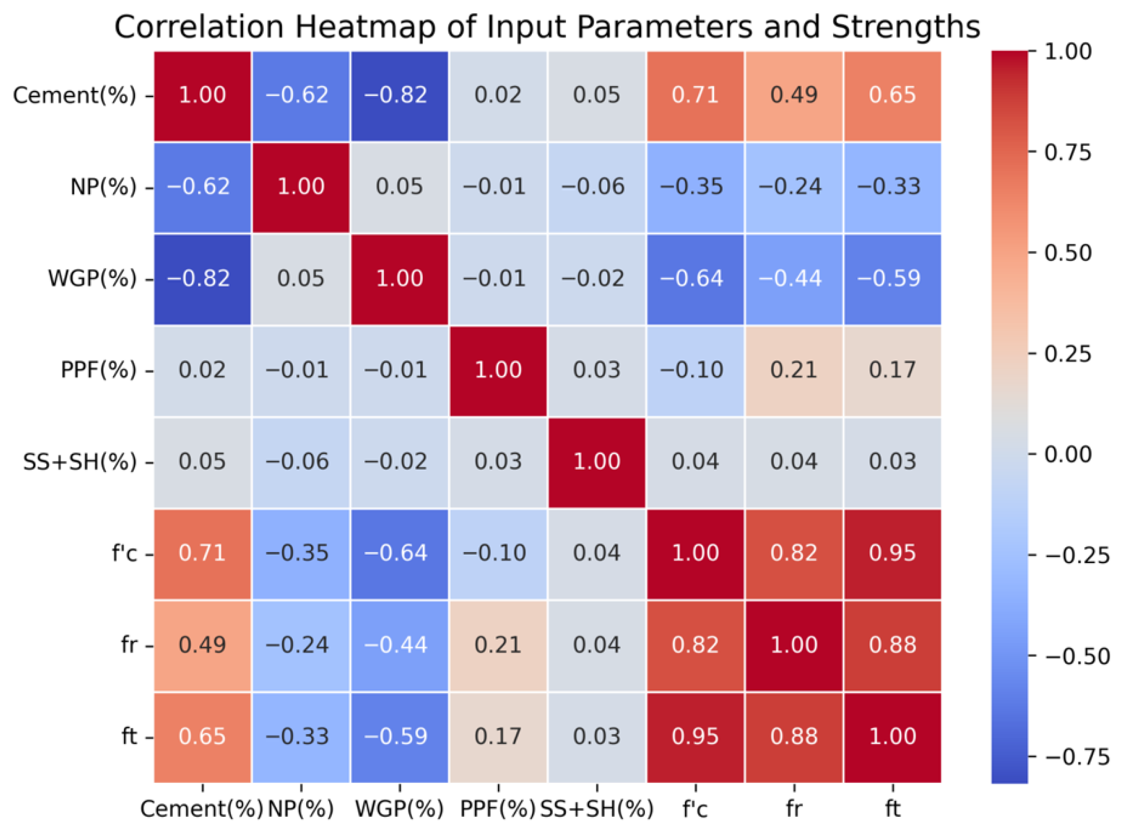 - The correlation analysis clearly shows that cement content and SS + SH level have the strongest positive impact on strength, while NP and WGP exhibit non-linear, dosage-sensitive behavior, highlighting the need for a balanced mix design.