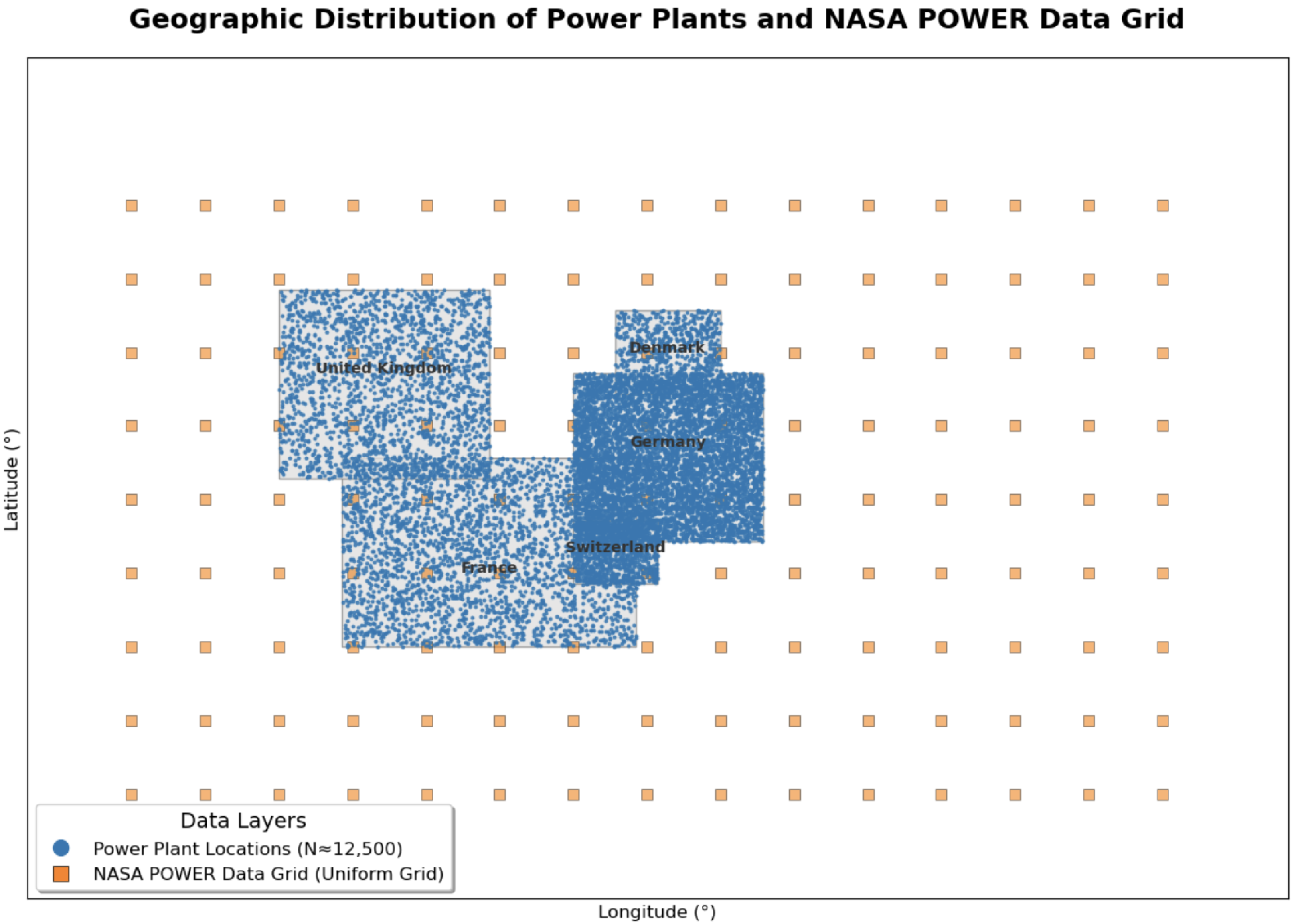 Geographic distribution of the power plant locations and the NASA POWER data grid used in this study. The dense blue points represent the locations of the 12,299 unique power plants, concentrated within the five study countries (United Kingdom, France, Germany, Switzerland, and Denmark). The sparse orange squares represent the uniform grid of the satellite-derived meteorological data. This visualization highlights the spatial mismatch that necessitates the use of the cKDTree algorithm for accurate feature matching.
