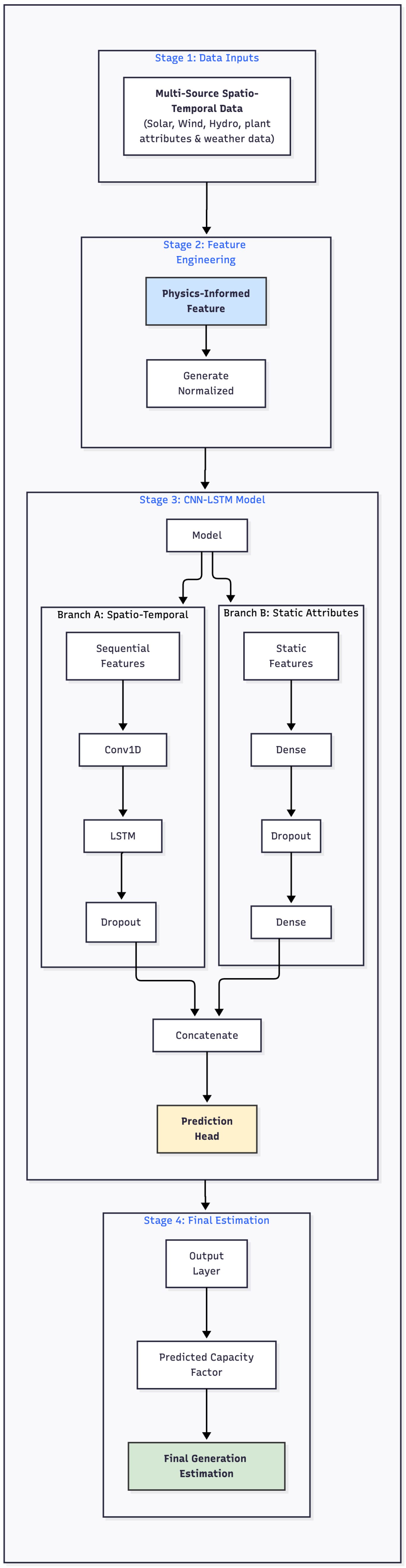 Conceptual framework of the CNN-LSTM approach for multi-source renewable energy estimation. The model integrates diverse inputs including solar, wind, hydro, and spatial weather data into a single deep learning architecture to produce concurrent generation estimates for each energy type.