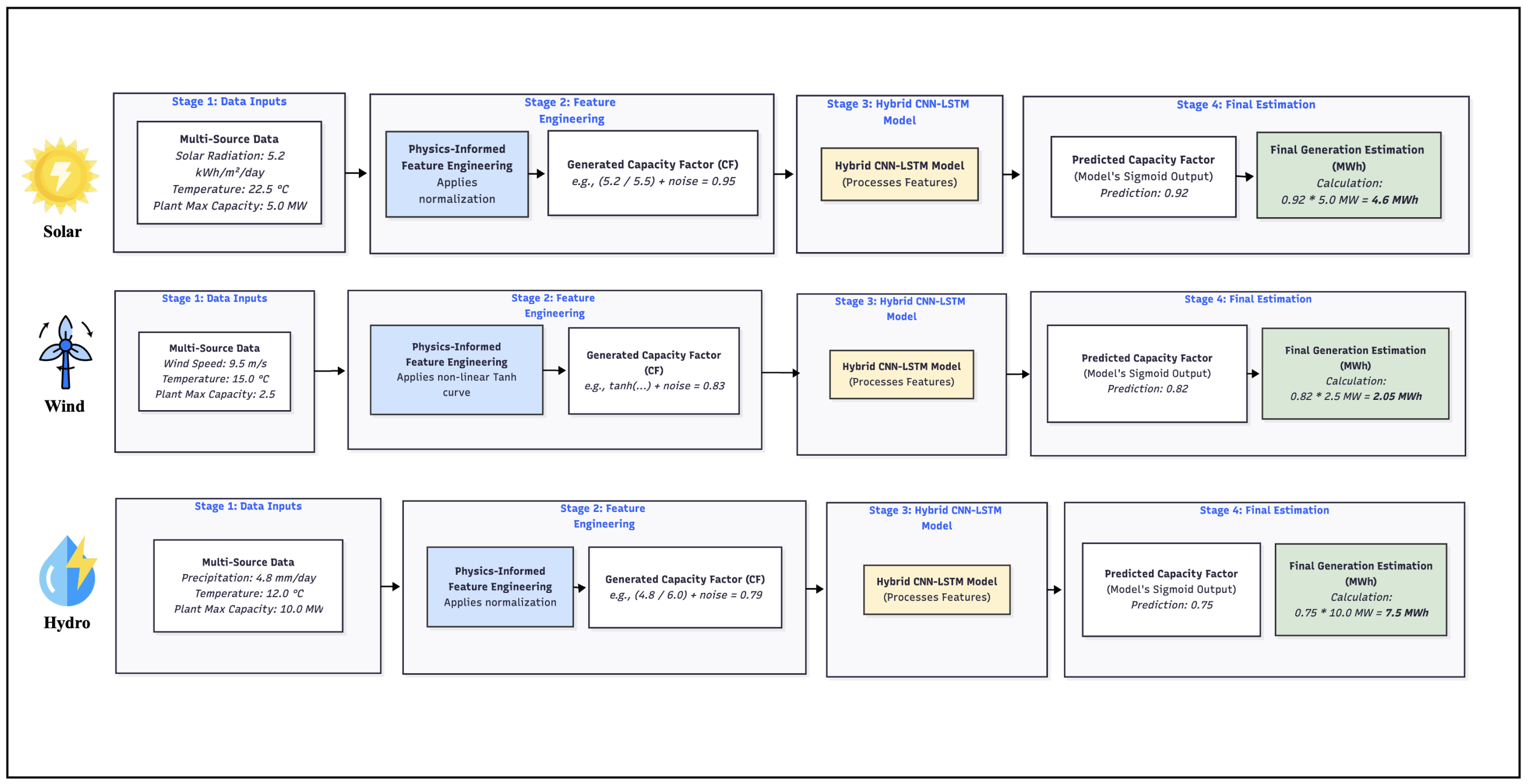 End-to-end workflow examples for Solar, Wind, and Hydro energy estimation. Each row demonstrates the four main stages of the proposed framework: (1) ingestion of source-specific spatio-temporal data; (2) application of physics-informed feature engineering to generate a normalized Capacity Factor; (3) processing through the unified hybrid CNN-LSTM model; and (4) conversion of the model’s predicted Capacity Factor into a final, real-world generation estimation in MWh.