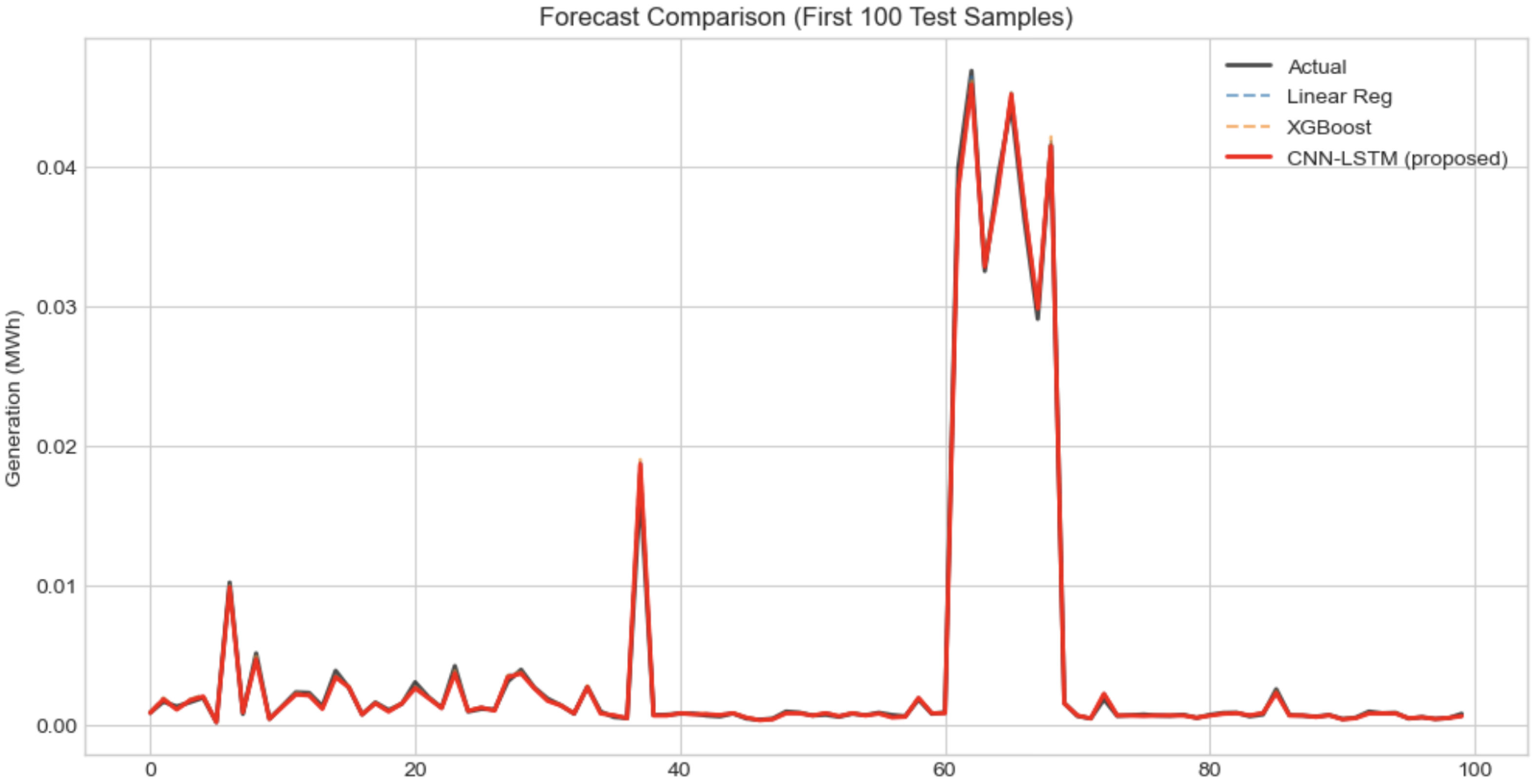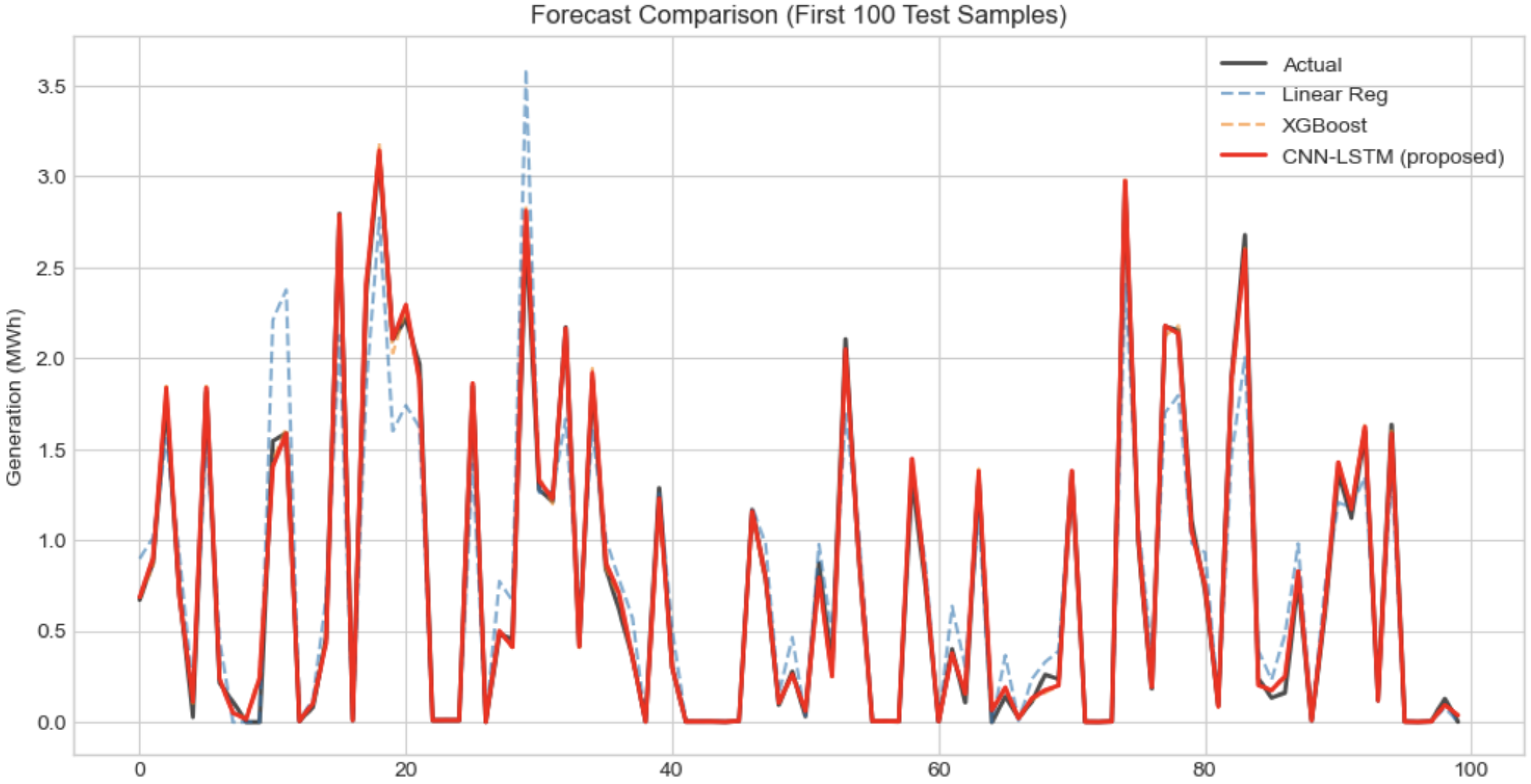 Forecast comparison of the first 100 test samples. The CNN-LSTM model (red) follows the actual generation (black) and baseline models, demonstrating its capability to capture rapid ramp-up and ramp-down events.