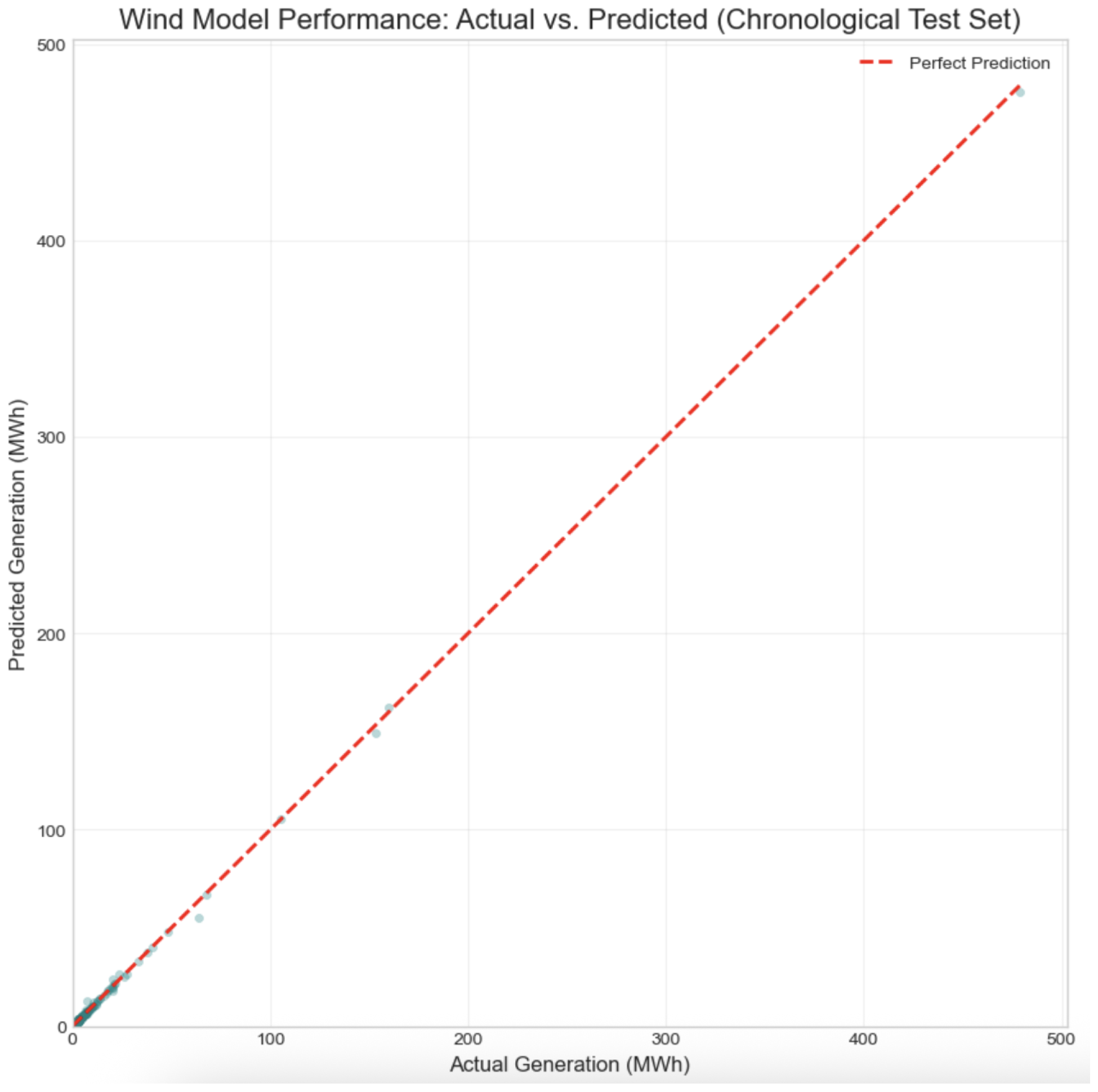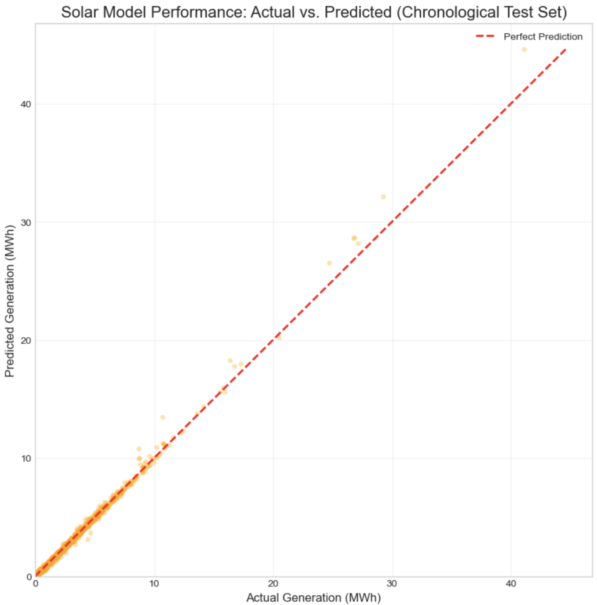 Actual vs. Predicted solar power generation on the chronological test set. The alignment along the diagonal confirms the model’s predictive accuracy.