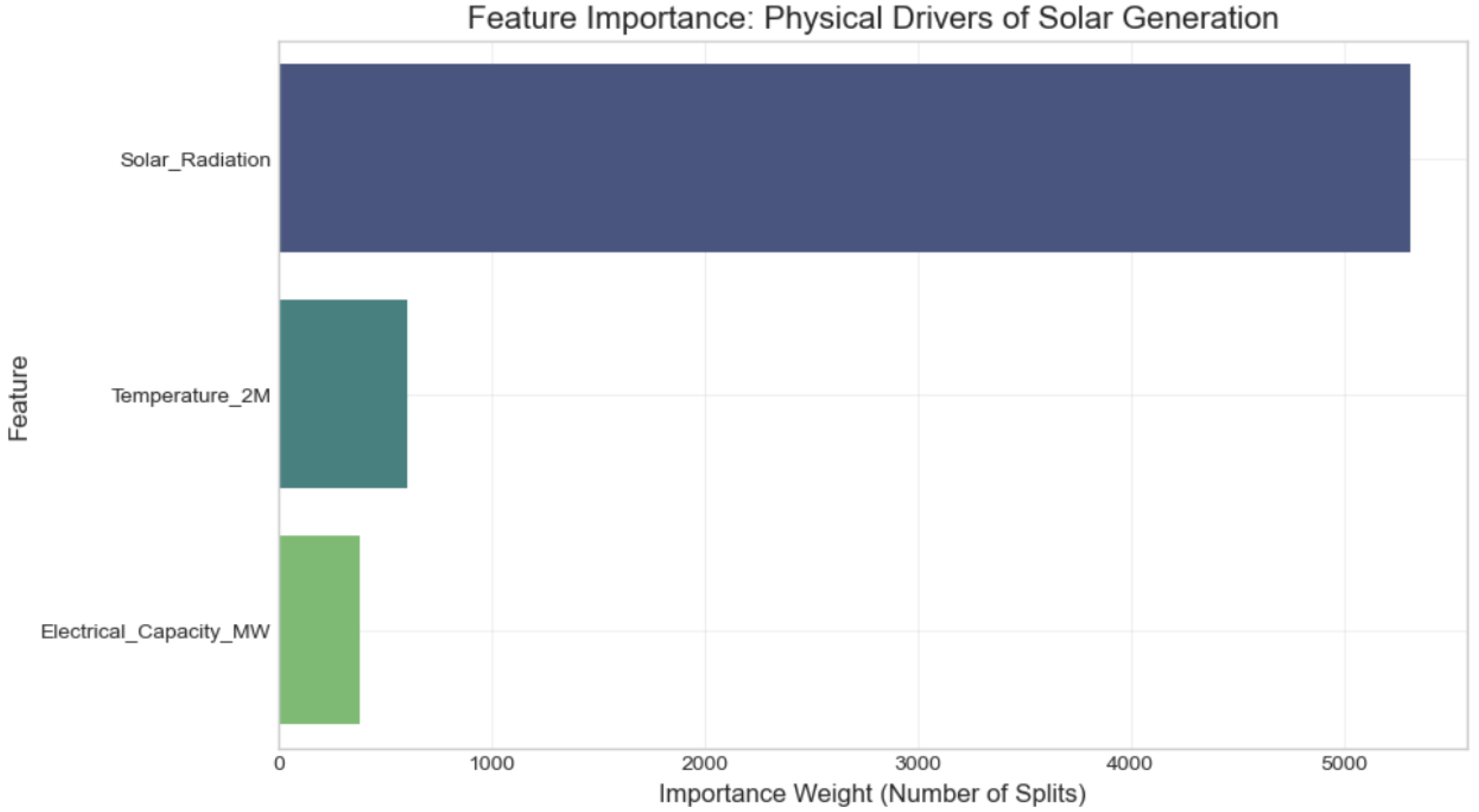 Feature Importance analysis for Solar Generation. The results confirm that Solar Radiation is the primary driver, validating the physical soundness of the dataset features.